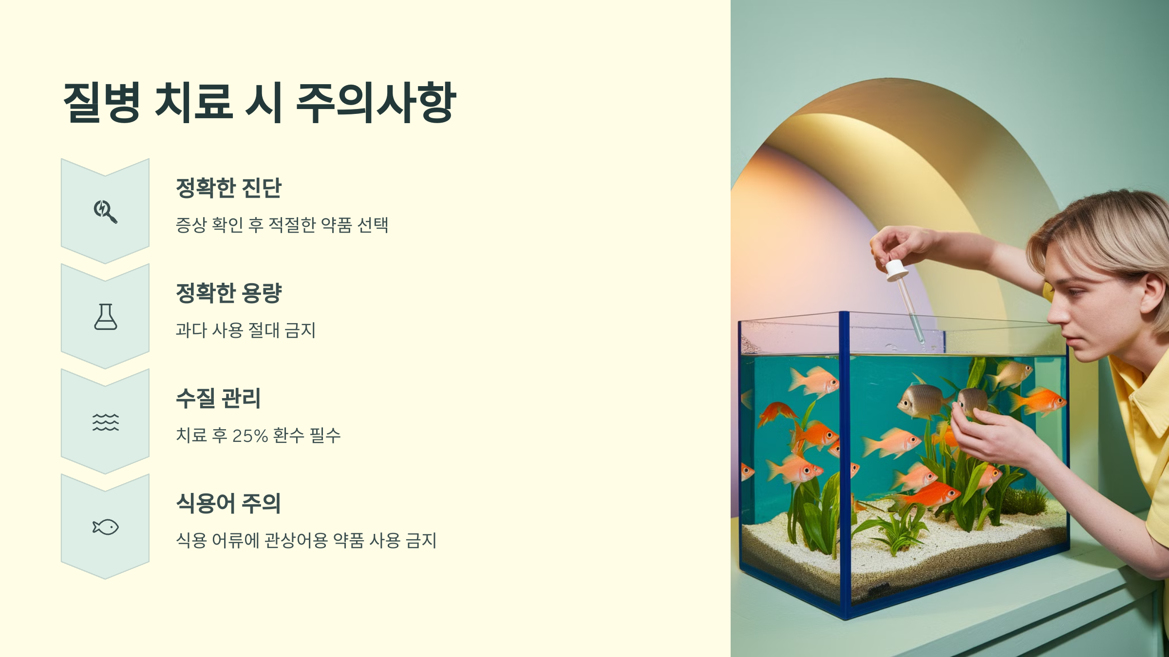 치료제 사용 시에는 정해진 양만 사용하고, 치료 중 물고기의 상태를 잘 살펴야 해요.