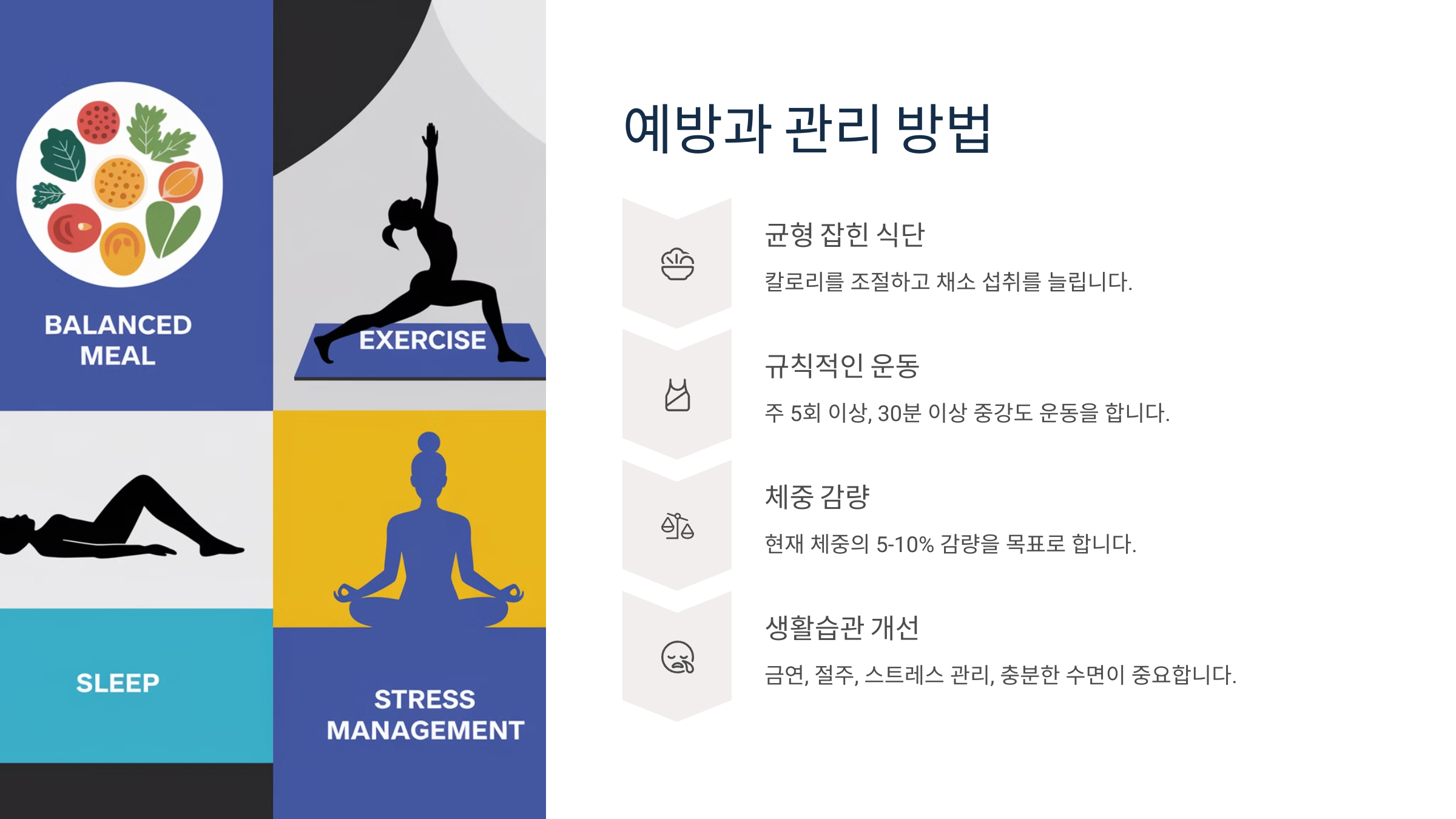 | 식사 | 저염, 고섬유질, 정제당 제한 | 칼로리 균형 유지 |