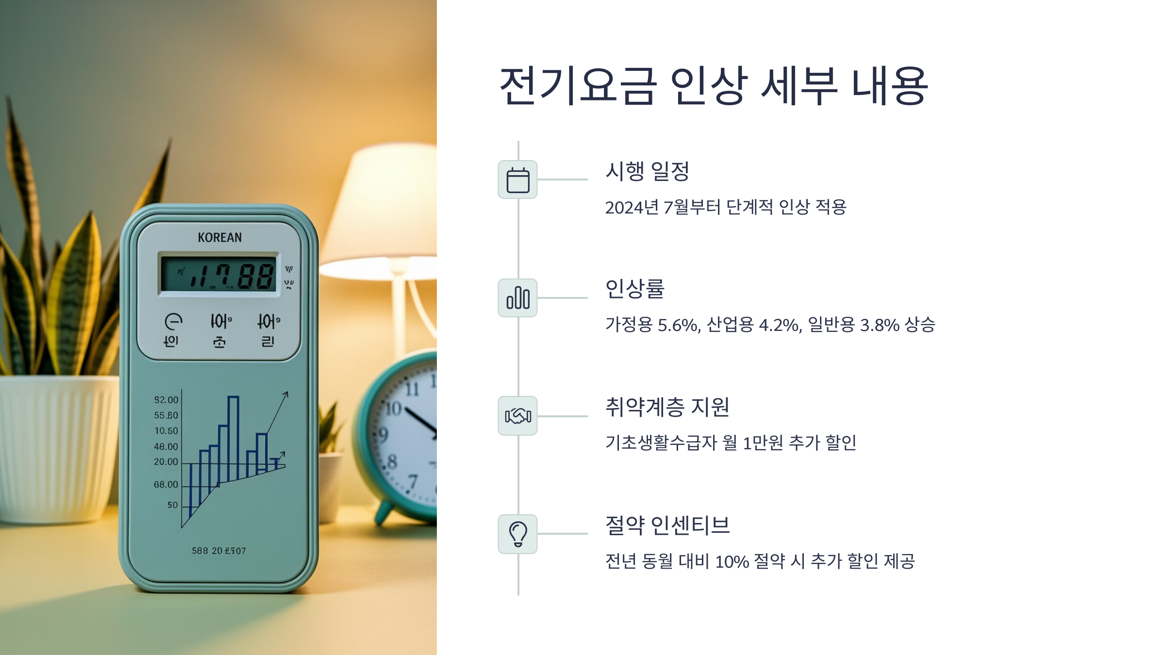 표를 보면 알 수 있듯이 사용량이 많을수록 요금 인상률이 낮지만, 구간이 조정되면서 실질적으로는 더 많은 가정이 높은 요금 구간에 해당될 수 있어요. 특히 1~2인 가구는 전기 절약 습관을 미리 드려두는 게 중요하겠죠! 🌱