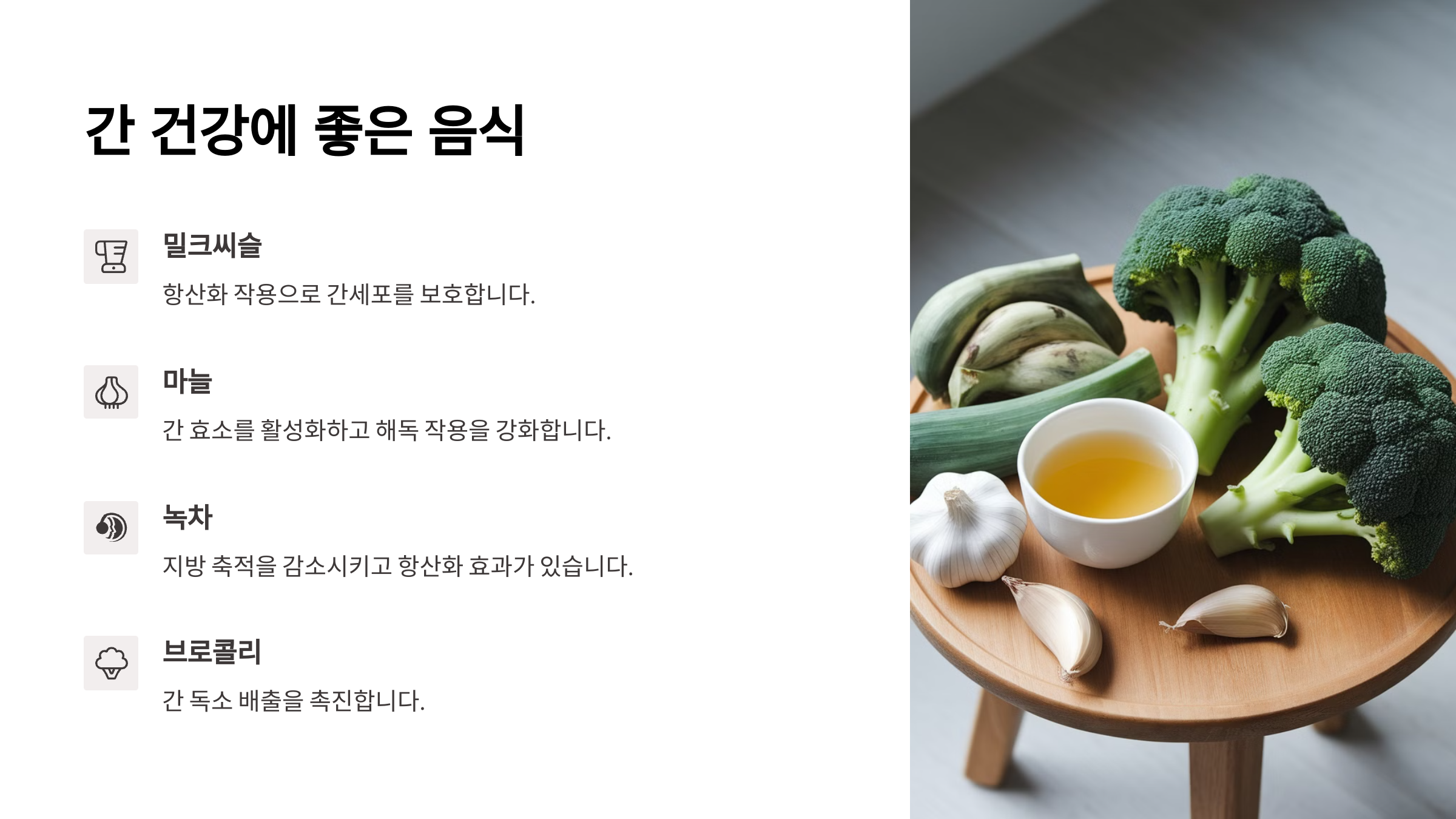 태그: 간건강, 간해독, 간에좋은음식, 지방간예방, 브로콜리효능, 마늘영양, 간수치개선, 항산화식품, 건강식단, 실리마린