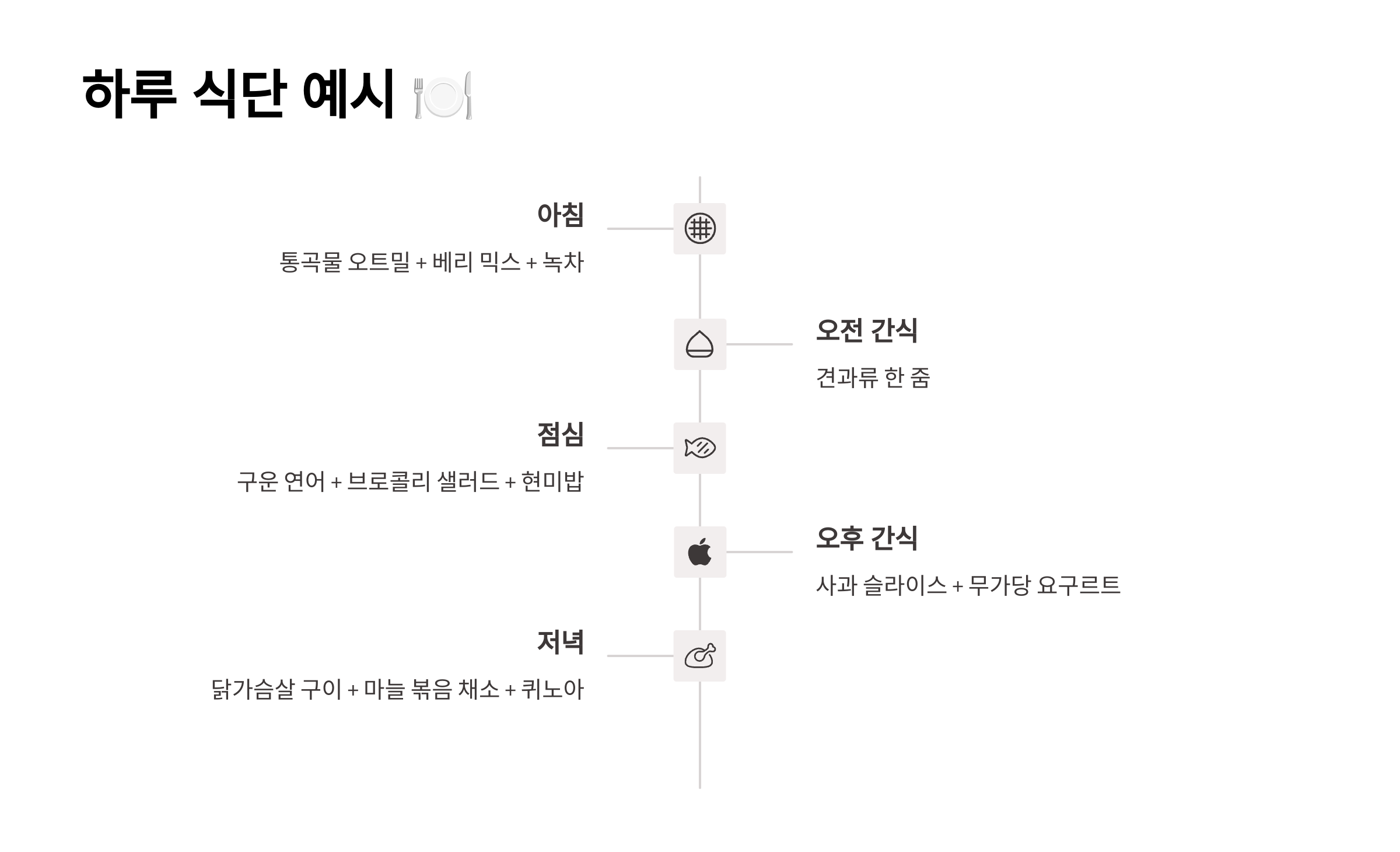 | 아침 | 귀리죽, 삶은 달걀, 브로콜리 | 소화 잘 되는 구성 |