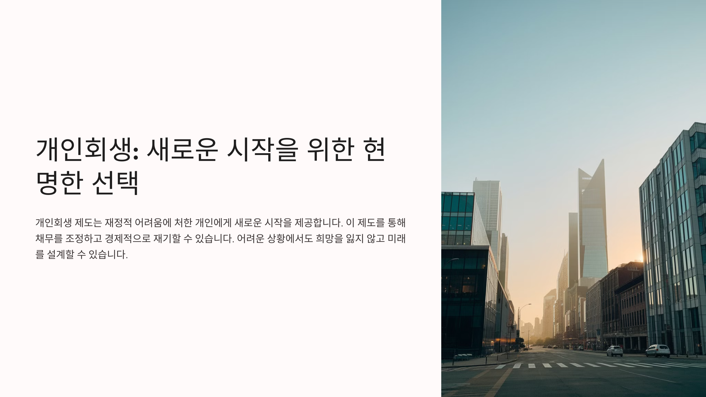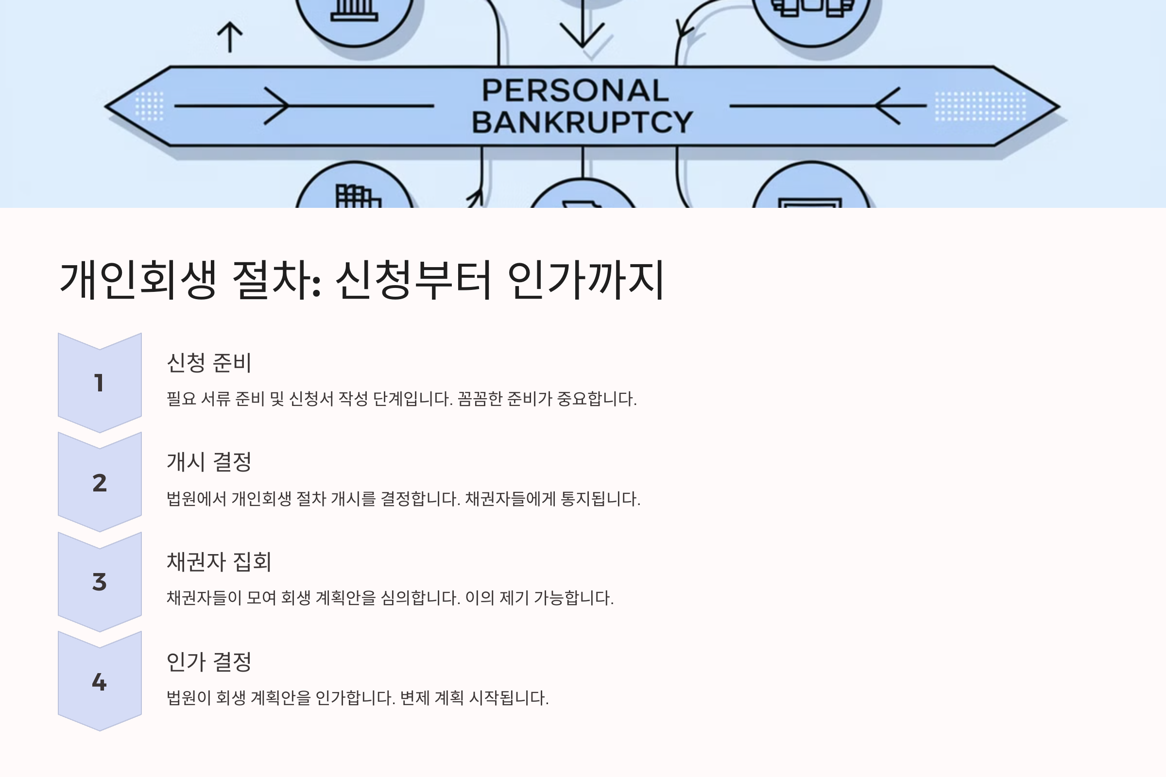 💡 개인회생이란? 경제적으로 어려운 사람들이 법원의 도움을 받아 채무를 조정하고, 일정 기간 동안 변제 후 나머지 빚을 탕감받을 수 있는 제도예요.