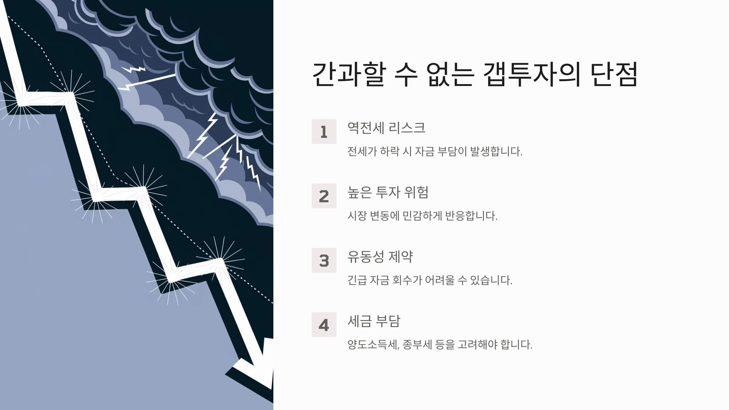 갭투자는 리스크가 크기 때문에, 철저한 시장 분석과 대비책 없이 무턱대고 투자하면 큰 손실로 이어질 수 있어요. 신중하게 접근하는 게 가장 중요해요! 😊