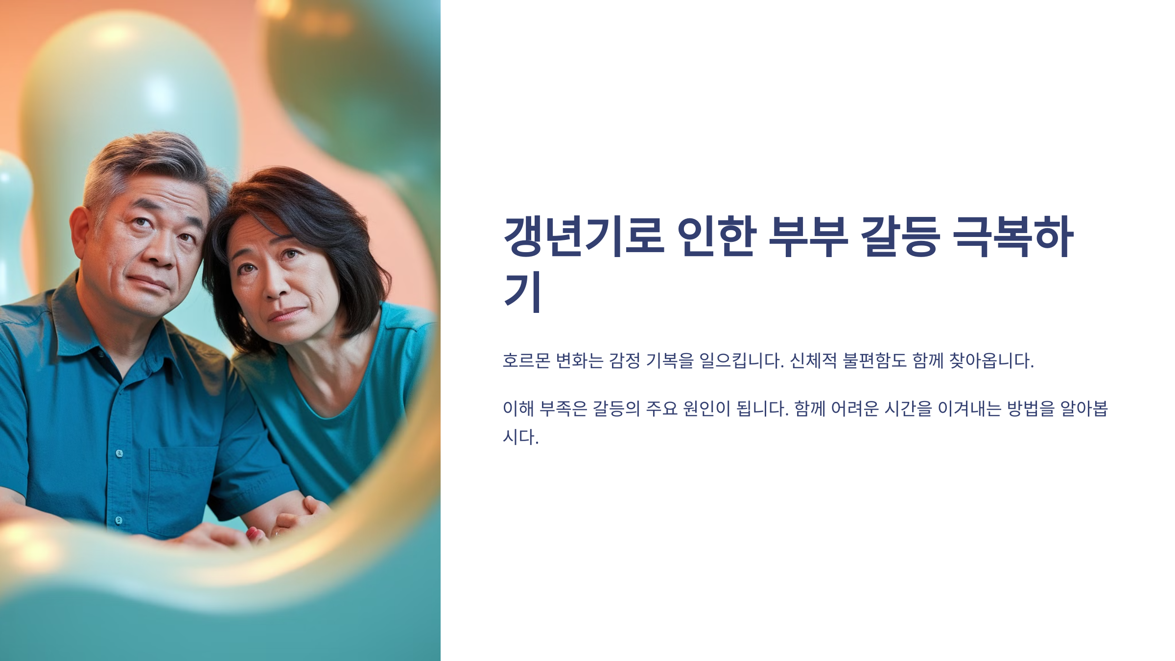 갱년기를 부부가 함께 이겨내는 가장 좋은 방법은 ‘다시 친구가 되는 것’이라고 생각해요. 잘 싸우고, 잘 풀고, 다정하게 표현하는 연습이 이 시기를 따뜻하게 바꿔줄 거예요.