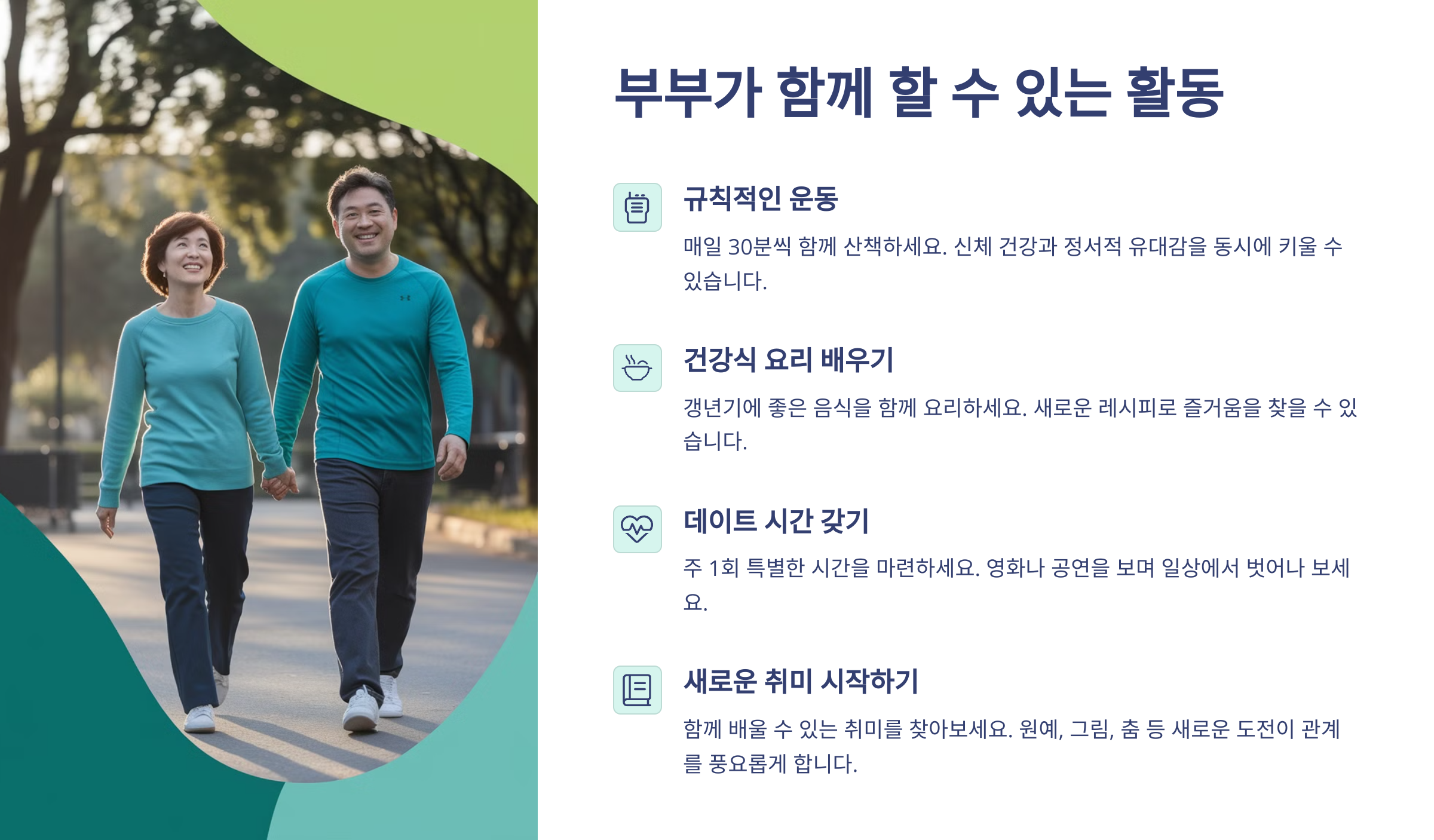 갱년기를 부부가 함께 잘 이겨내려면 ‘공동의 시간’을 만들어야 해요. 소소하지만 꾸준히 함께할 수 있는 활동들이 서로를 더 이해하는 계기가 돼요.