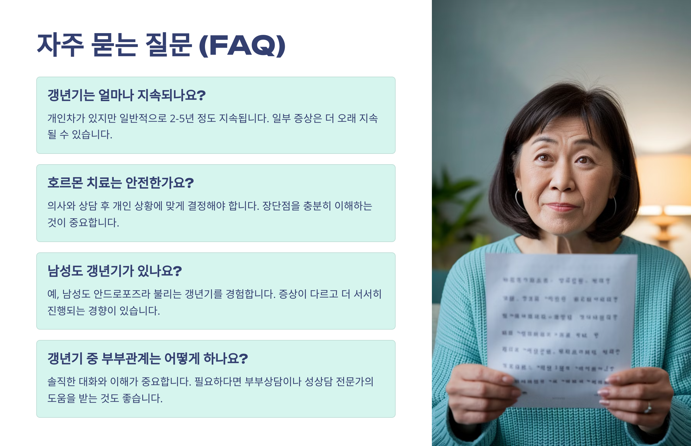 A1. 먼저 감정이 아니라 정보로 접근해보세요. “이건 실제로 의학적으로 있는 증상이야. 내 몸이 진짜 달라졌어”라고 차분히 말해보세요.