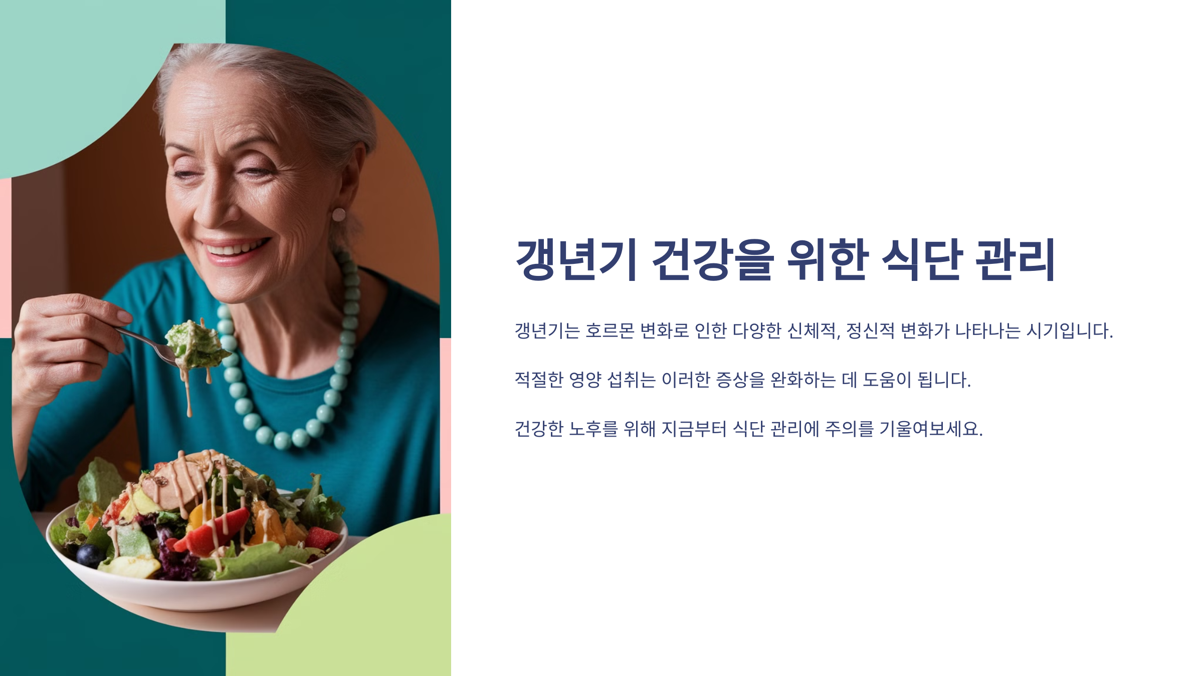 갱년기 시기에는 몸의 호르몬 균형이 크게 흔들려요. 이 변화는 체온 조절, 기분 변화, 수면 패턴, 뼈 건강, 심지어는 체중 증가까지 다양한 증상으로 이어질 수 있죠. 그래서 갱년기엔 단순한 ‘다이어트 식단’이 아니라, ‘균형 잡힌 회복 식단’이 더 중요해요.
