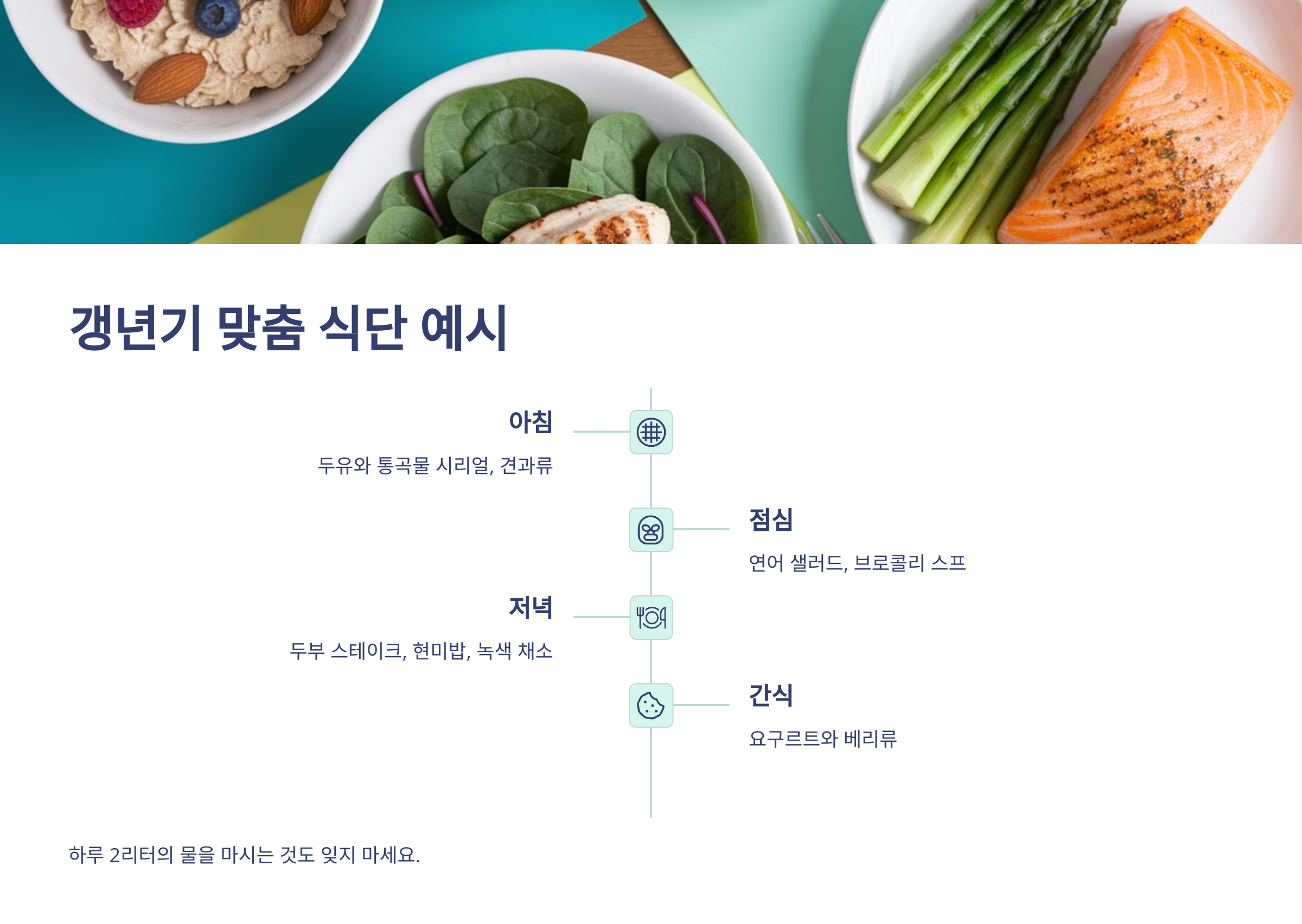 하루 식단을 이런 식으로 구성하면, 체중도 자연스럽게 조절되고 갱년기 증상도 훨씬 완화될 수 있어요. 건강한 습관이 제일 강한 치료법이에요!