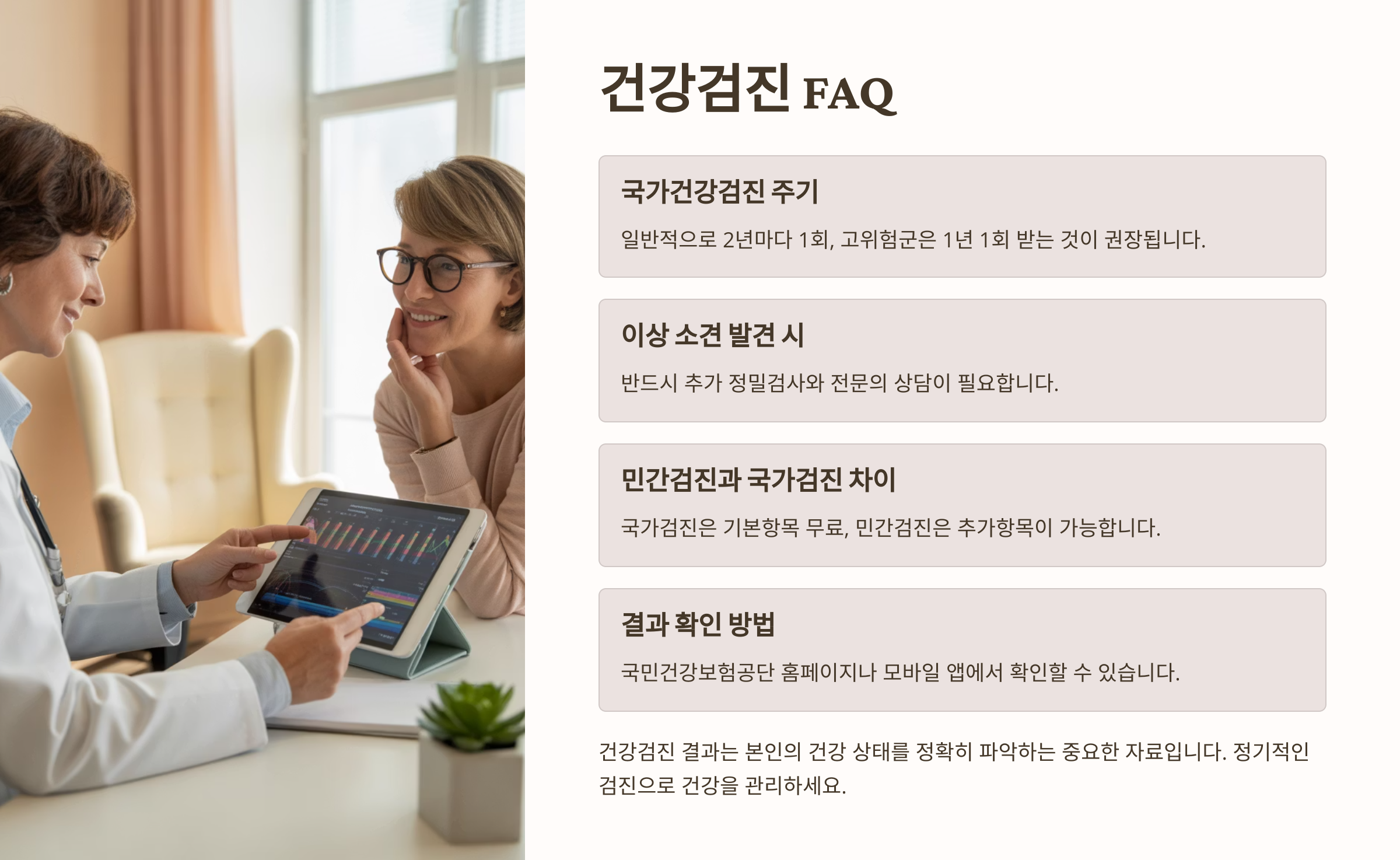 A1. 국가 건강검진은 2년에 한 번씩 제공되며, 일부 항목은 1년마다 받는 경우도 있어요. 개인 건강 상태에 따라 매년 받는 것도 추천돼요.