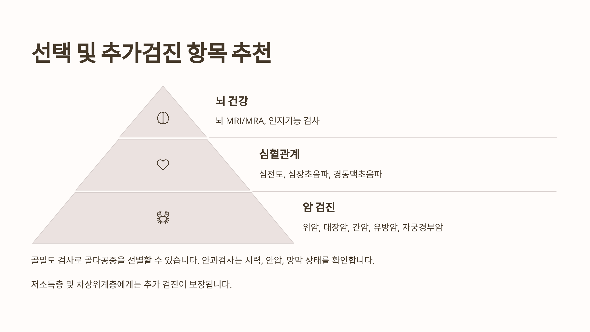 기본 검진만으로는 부족한 부분이 있을 수 있어요. 특히 가족력이나 고위험군에 해당하는 분들은 추가 검진을 고려해야 해요. 예를 들어 대장암, 위암, 유방암, 갑상선, 골밀도, 심장 초음파 등이 있답니다.