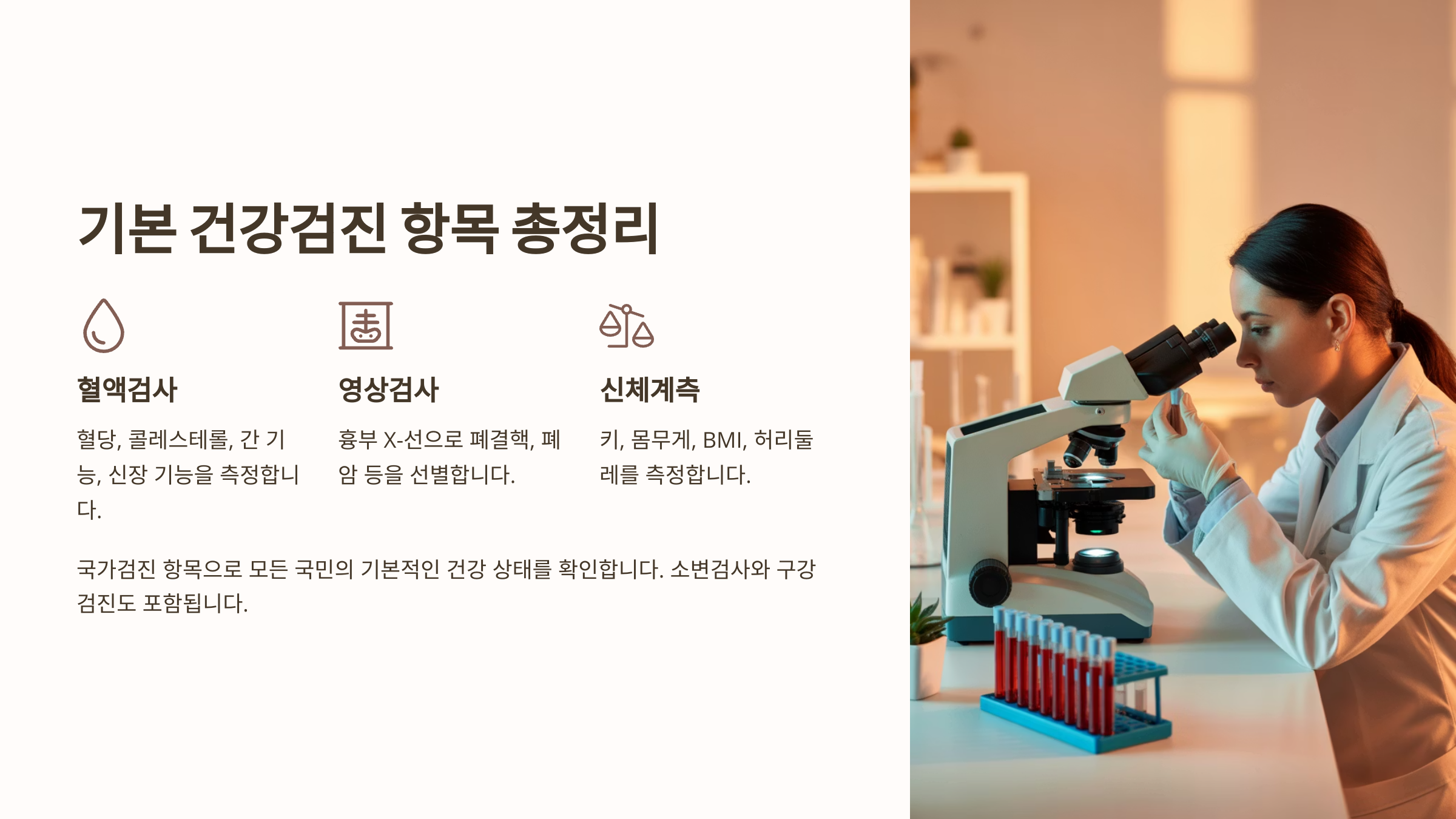 기본 건강검진은 대개 공복 상태에서 이루어지며, 필수 항목이 정해져 있어요. 혈압, 혈당, 콜레스테롤, 간 기능, 신장 기능, 간염 검사, 흉부 엑스레이, 소변 검사, 시력 및 청력 등이 포함돼요. 이 정도만 해도 내 몸의 전반적인 상태를 체크할 수 있어요.