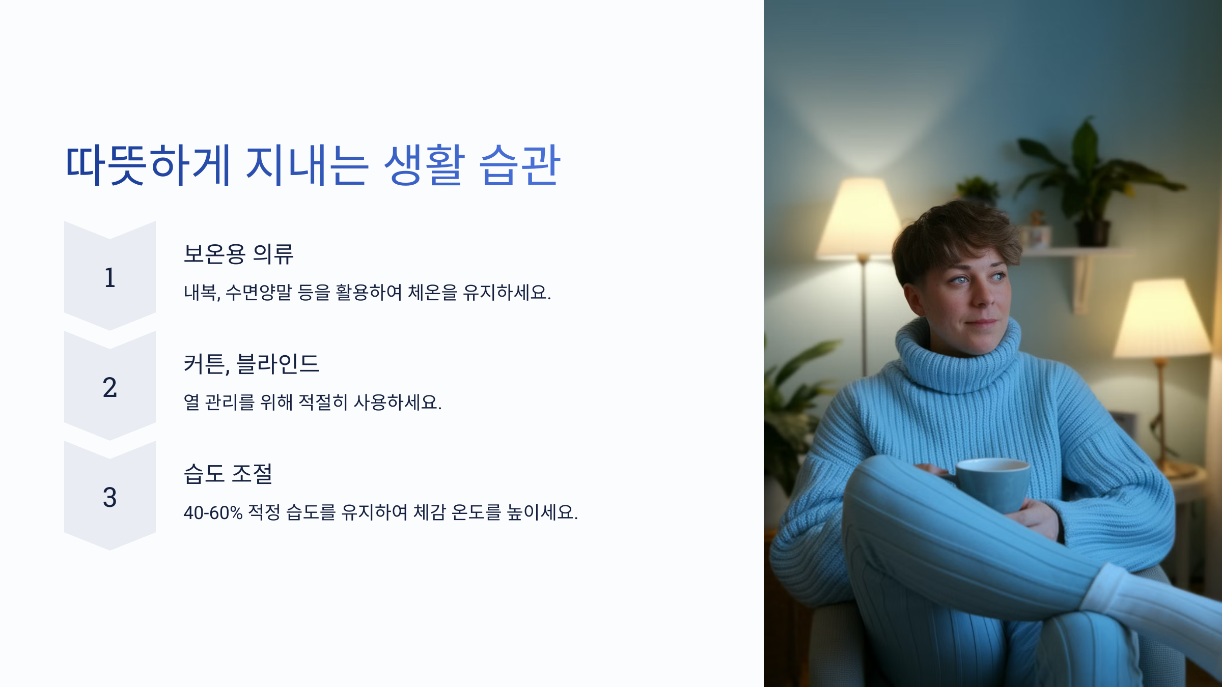 따뜻한 옷을 입고, 실내에서 적절한 습도를 유지하는 것도 난방비 절약에 큰 도움이 돼요. 작은 습관만 바꿔도 체감 온도를 3~4도 더 높일 수 있어요! ✅