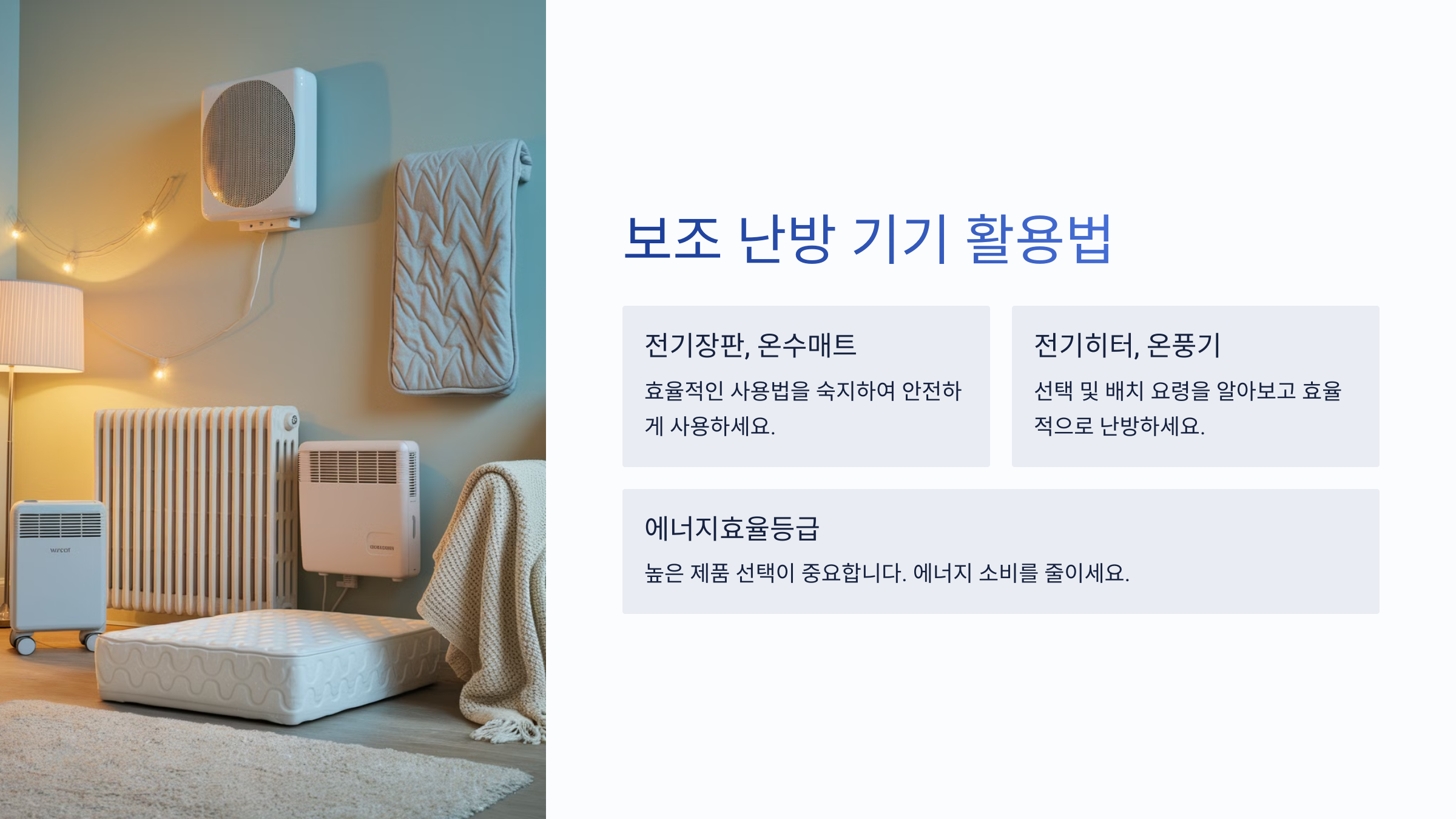 이런 보조 난방 기기를 적절히 활용하면 난방비를 최대 40%까지 절감할 수 있답니다! 😊