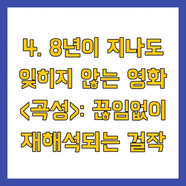 <곡성> 은 개봉 후 8년이 지난 지금까지도 많은 사람들에게 회자되고 재해석되는 작품입니다. 이는 <곡성> 이 단순한 오락 영화가 아니라, 인간의 본성과 사회 현상에 대한 깊이 있는 통찰 을 담고 있기 때문입니다. 여러 번 반복해서 볼수록 새로운 의미를 발견할 수 있다는 점 또한 <곡성>의 매력입니다. 숨겨진 복선, 상징, 그리고 다양한 해석의 가능성은 <곡성> 을 끊임없이 재관람하게 만드는 원동력입니다.