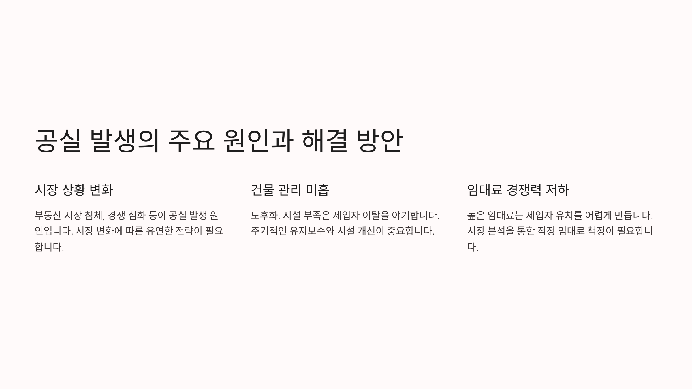 📢 공실을 해결하려면 먼저 왜 공실이 발생하는지 이해하는 것이 중요해요. 지역적인 문제, 건물 상태, 임대료 등이 공실률에 영향을 줘요.