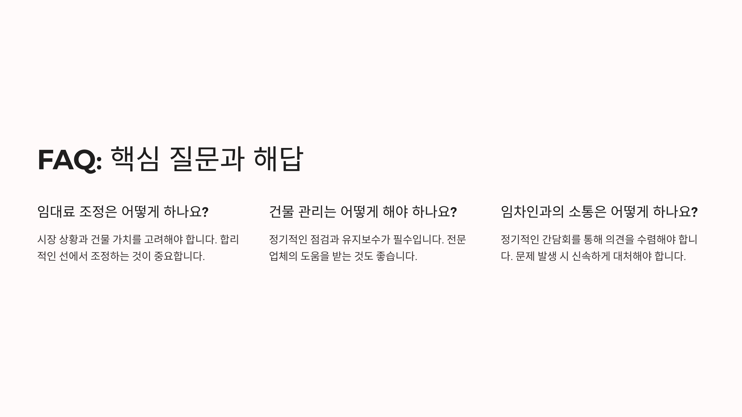 🏢 건물의 상태가 좋을수록 세입자의 만족도가 높아지고, 공실률이 낮아져요. 건물 유지보수를 철저히 하면 장기 임대 계약 유도에도 유리해요.