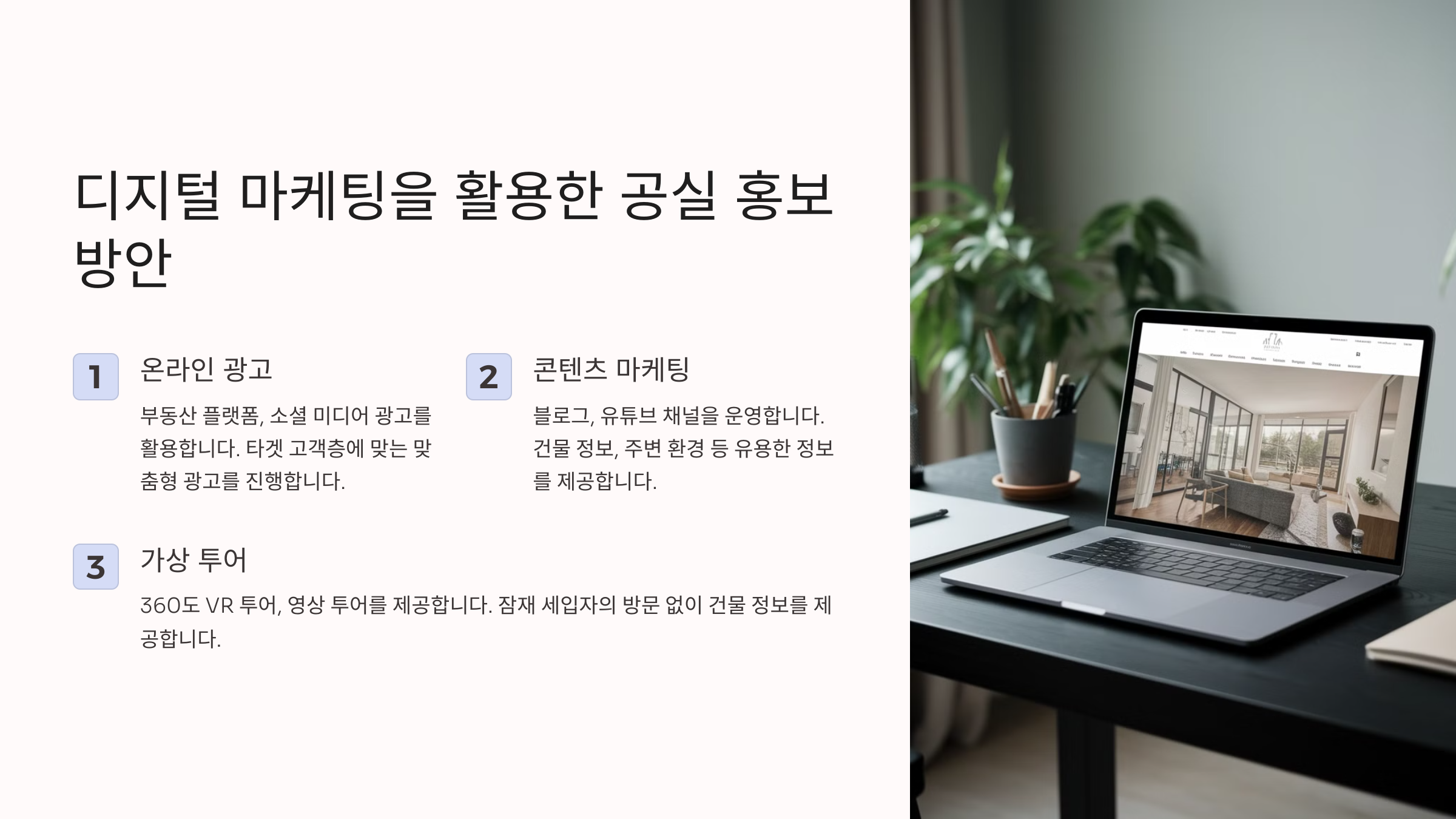 📢 세입자를 빠르게 유치하려면 온라인 & 오프라인 마케팅 전략을 잘 활용해야 해요. 적절한 광고와 홍보 방법을 사용하면 공실을 줄일 수 있어요.