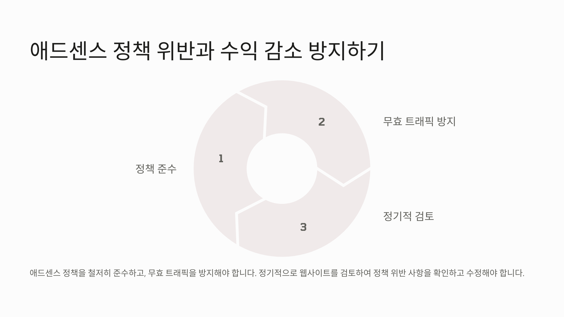 A7. 부정 클릭(본인이 직접 광고 클릭), 무효 트래픽, 저작권 위반 콘텐츠, 성인·폭력적 콘텐츠 게시 등이 주요 정지 사유예요.
