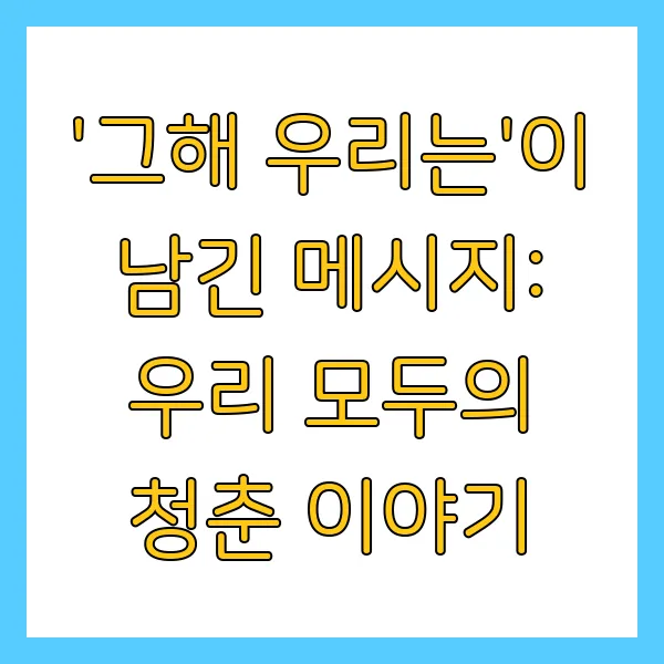 '그해 우리는'은 단순한 로맨스 드라마를 넘어, 우리 모두의 청춘을 이야기합니다. 과거의 상처와 불안감을 극복하고 성장해 나가는 주인공들의 모습은 시청자들에게 깊은 공감과 위로를 전달합니다. 드라마는 진정한 자아를 찾고, 주변 사람들과의 관계를 통해 성장해 나가는 것의 중요성을 강조합니다. '그해 우리는'은 우리에게 묻습니다. "당신의 청춘은 어떤 모습인가요?" 그리고 이 질문은 드라마가 끝난 후에도 우리의 마음속에 깊은 여운을 남깁니다. '그해 우리는'은 우리 모두의 청춘, 그리고 그 안에서 피어나는 사랑과 성장의 이야기입니다.