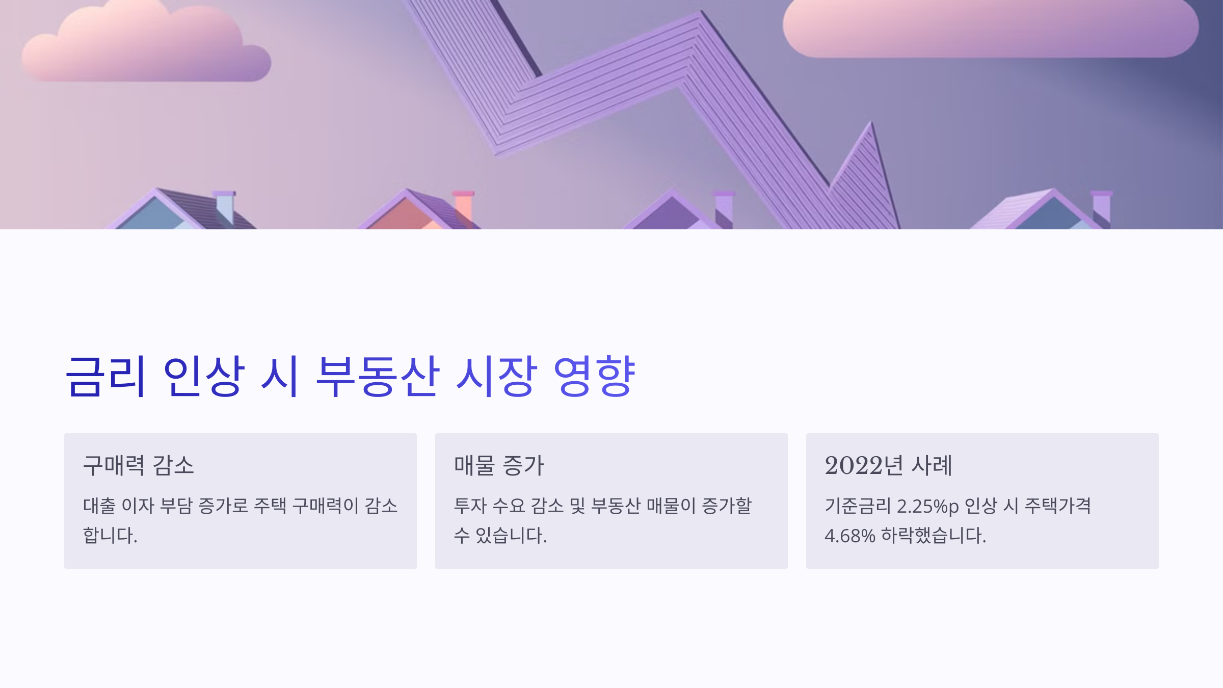 금리와 부동산 가격은 뗄 수 없는 관계예요. 금리가 오르면 대출이자 부담이 커지고, 사람들이 집을 사기보다는 기다리게 돼요. 이렇게 수요가 줄어들면 자연스럽게 집값도 하락하게 되죠.
