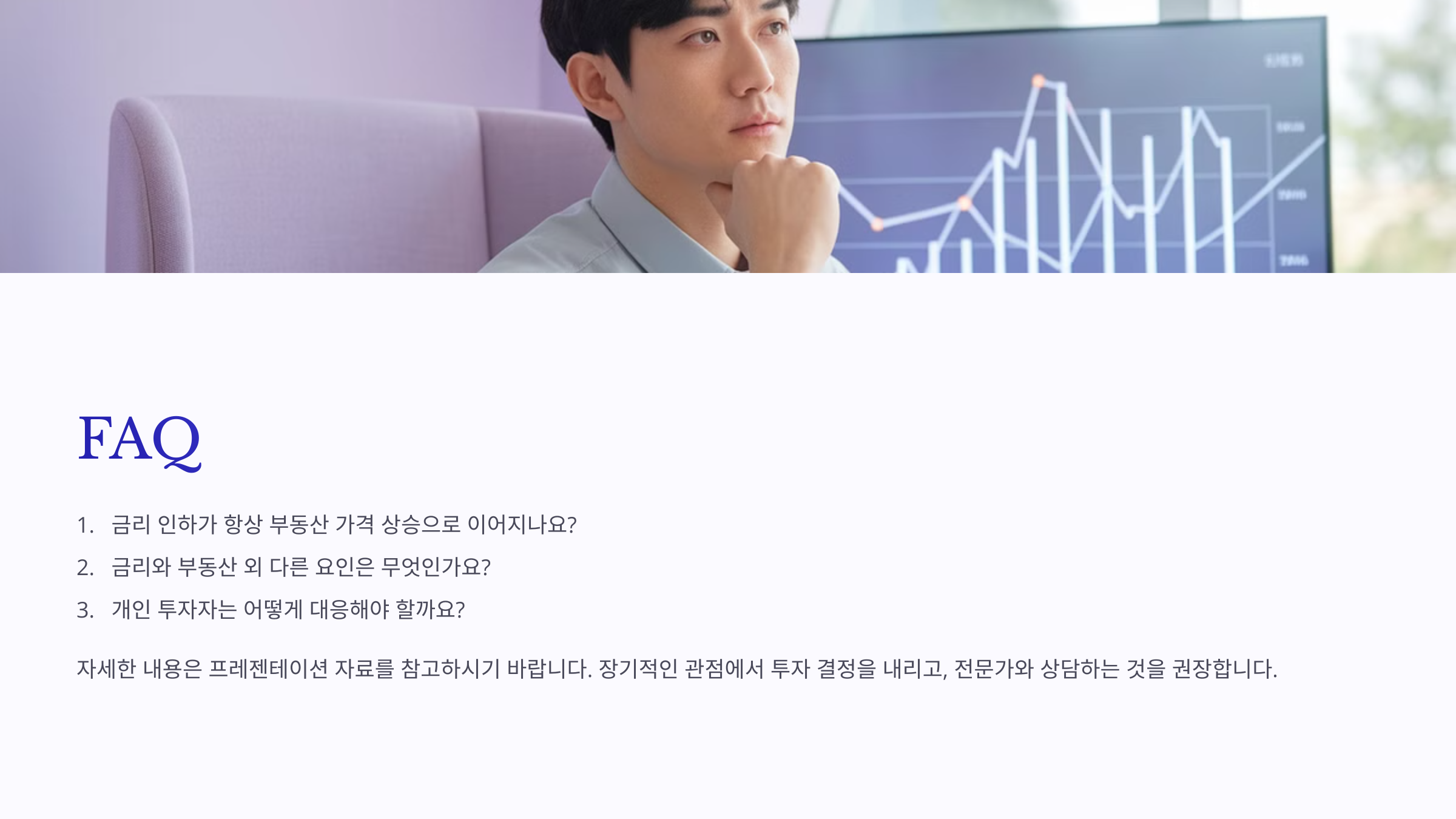 이렇게 앞으로도 금리는 계속해서 부동산 시장의 중요한 변수로 작용할 거예요. 관심을 끊지 말고 꾸준히 시장을 지켜보는 게 현명한 투자자가 되는 비결이랍니다! 🧐