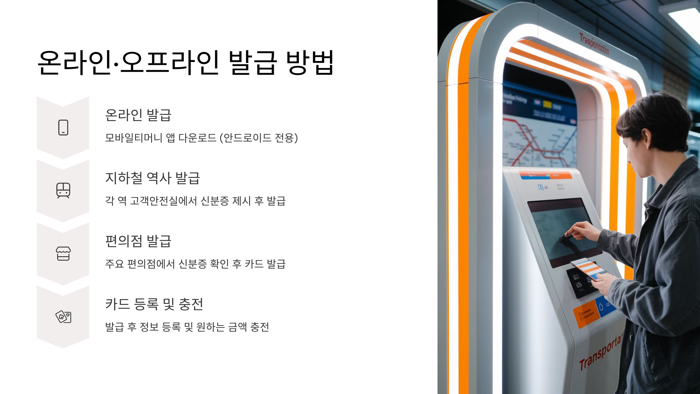 오프라인은 서울시 주요 지하철역 내 고객센터에서 직접 신청도 가능하고, 실물 카드도 현장에서 수령할 수 있어요. 사용법도 친절하게 안내해준답니다.