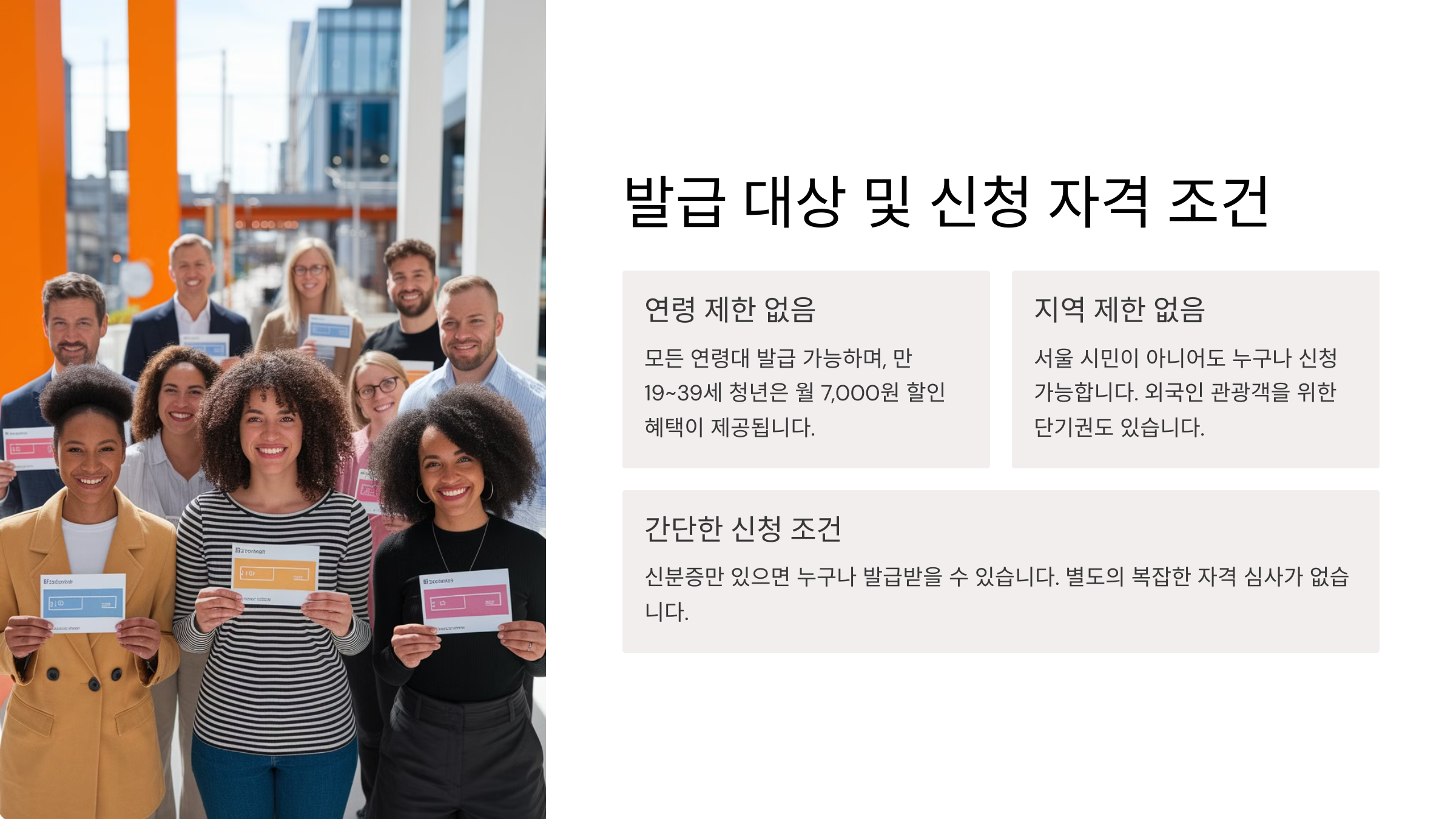 서울시에 주민등록이 되어 있는 사람이라면 청년, 직장인, 학생, 노년층 누구든 발급받을 수 있어요. 단, 만 14세 미만은 부모 동의 및 대리 신청이 필요하다는 점 기억하세요.