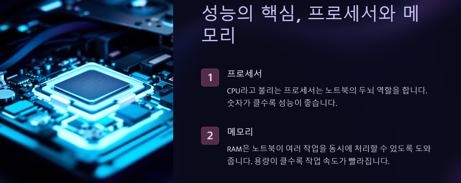 프로세서(CPU)는 노트북의 두뇌 역할을 해요. 인텔과 AMD가 대표적인 제조사인데, 인텔의 코어 i5나 i7, AMD의 라이젠 5나 7 시리즈가 대중적이에요. 성능이 높을수록 더 빠르게 작업을 처리할 수 있죠.