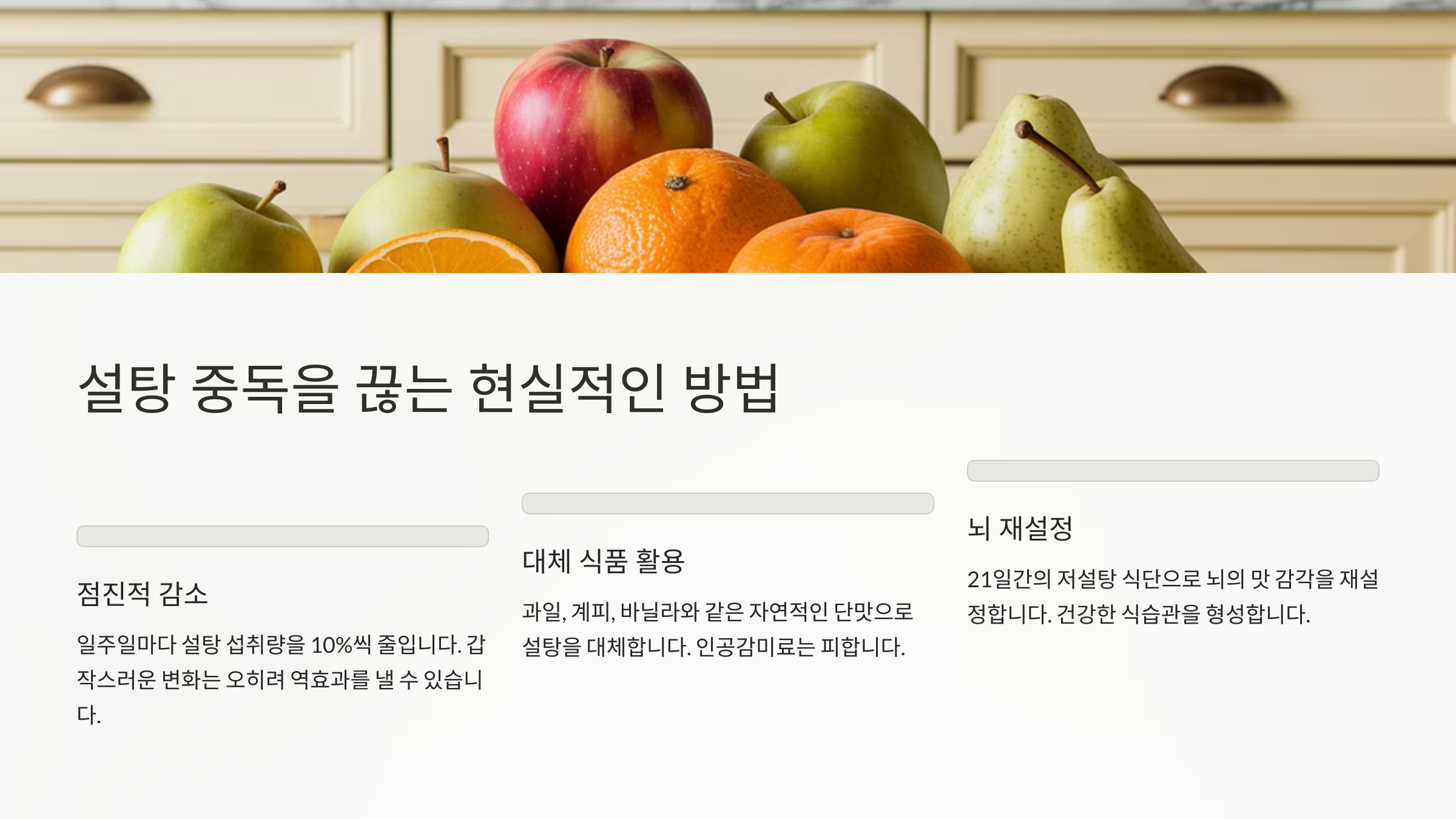 그리고 마지막은 규칙적인 수면과 식사예요. 피곤할수록 단 음식이 당기기 때문에, 설탕 중독을 줄이기 위해선 기본 생활 습관부터 안정시켜야 해요. 내가 단 걸 원할 때, 정말 배고픈 건지 감정적인 건지 구분해보는 것도 좋은 방법이에요.
