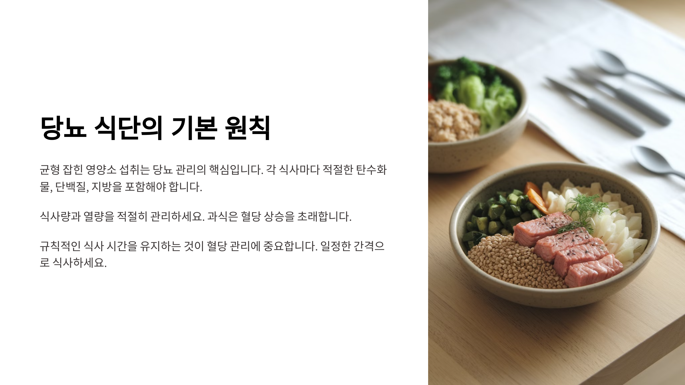 👇 아래에선 당뇨 식단의 원칙부터 균형 잡힌 구성까지 알아보고, 실제 하루 식단 예시와 추천 음식까지 쭉~ 정리해볼게요!