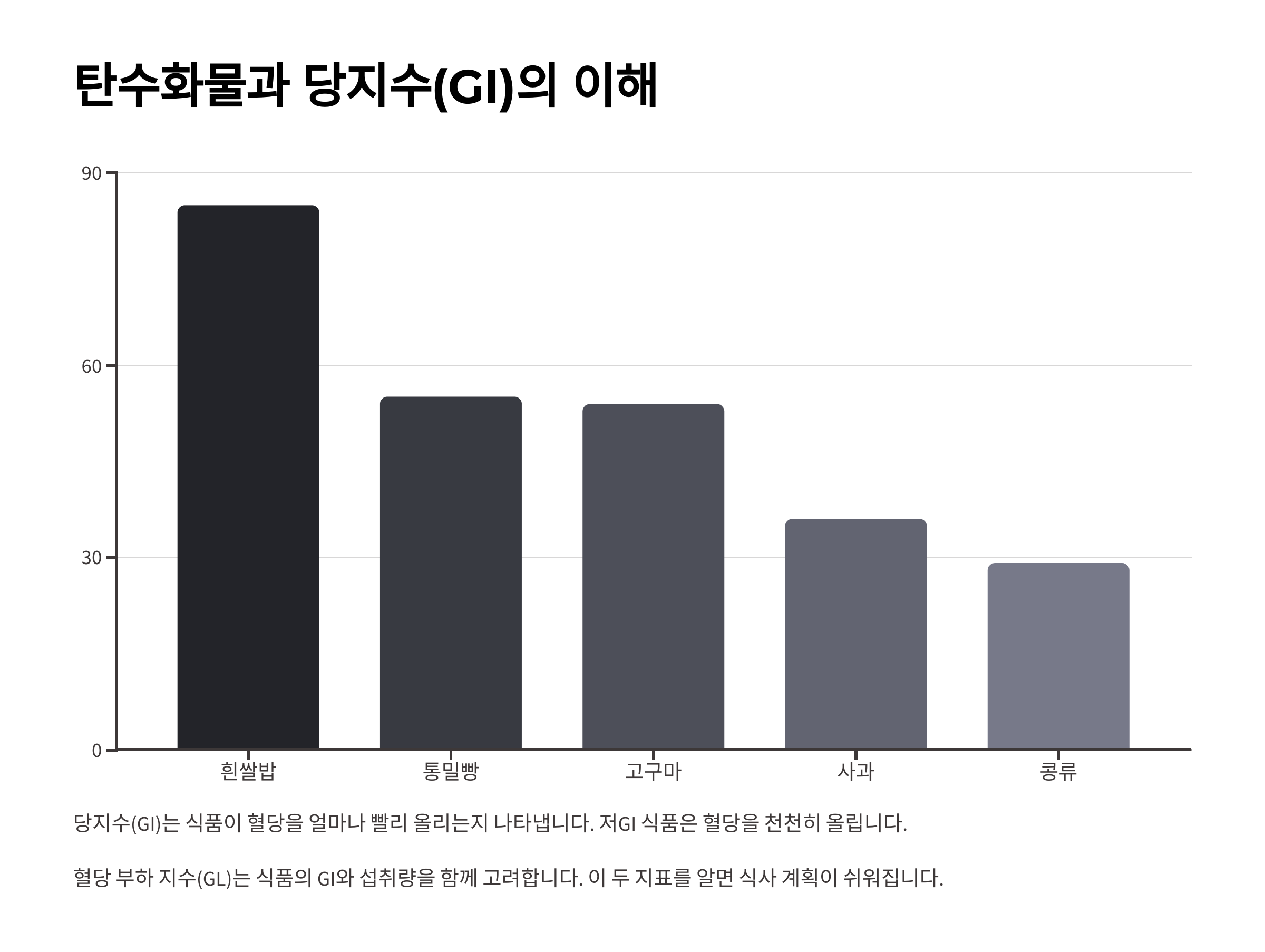 GI만 보는 것보단 '탄수화물의 양'도 같이 고려해야 해요. 같은 GI를 가진 음식이라도 얼마나 많이 먹느냐에 따라 혈당 반응이 달라지거든요. 그래서 ‘당지수(GI)’와 ‘당부하지수(GL)’를 함께 보는 것도 좋은 방법이에요.