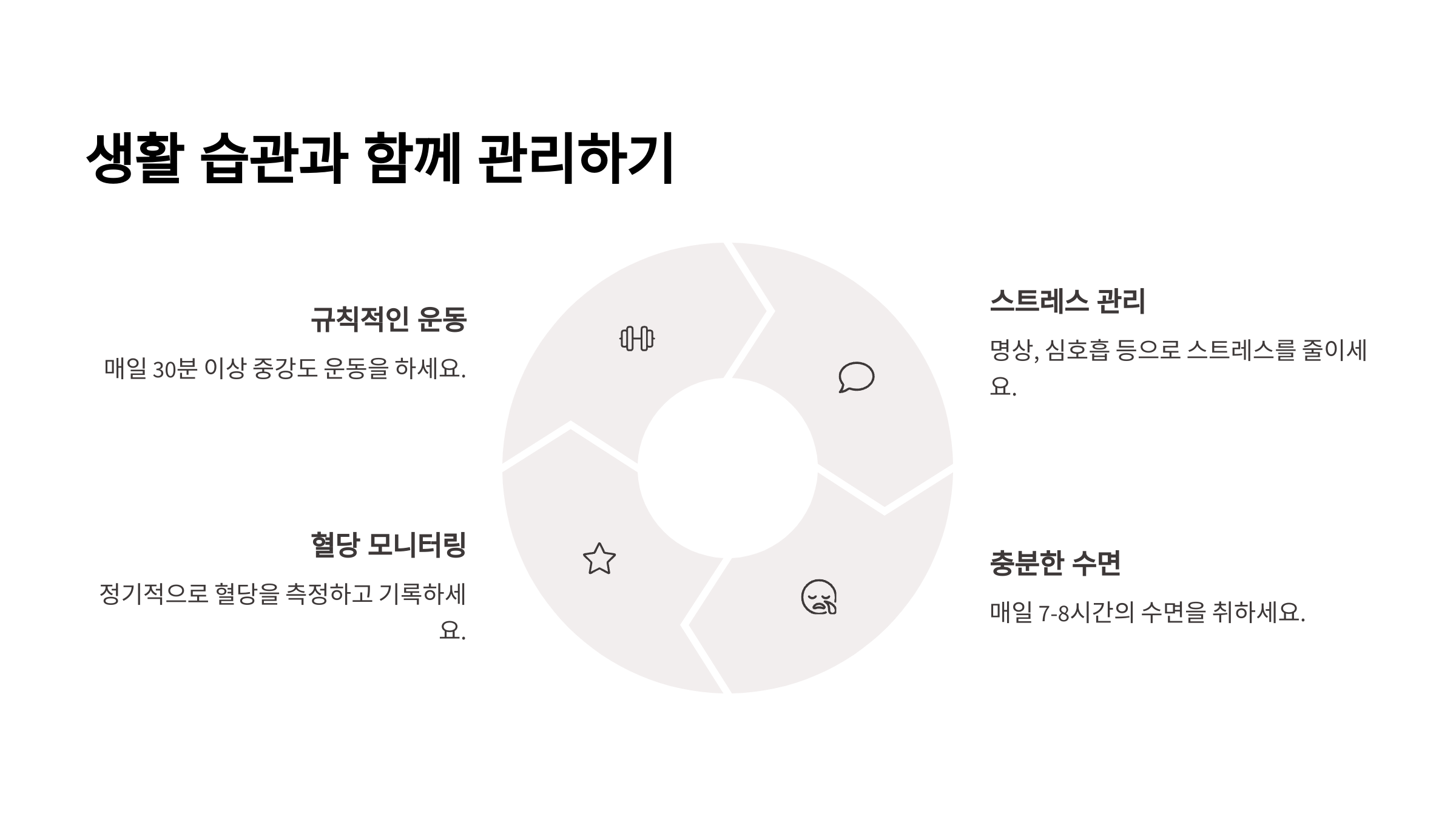 당뇨 식단만 잘 지켜도 혈당 관리에 큰 도움이 되지만, 식사 외의 생활 습관도 함께 신경 써야 해요. 식단과 운동, 수면, 스트레스 관리가 모두 어우러져야 당뇨가 악화되지 않고 안정적으로 유지될 수 있거든요.