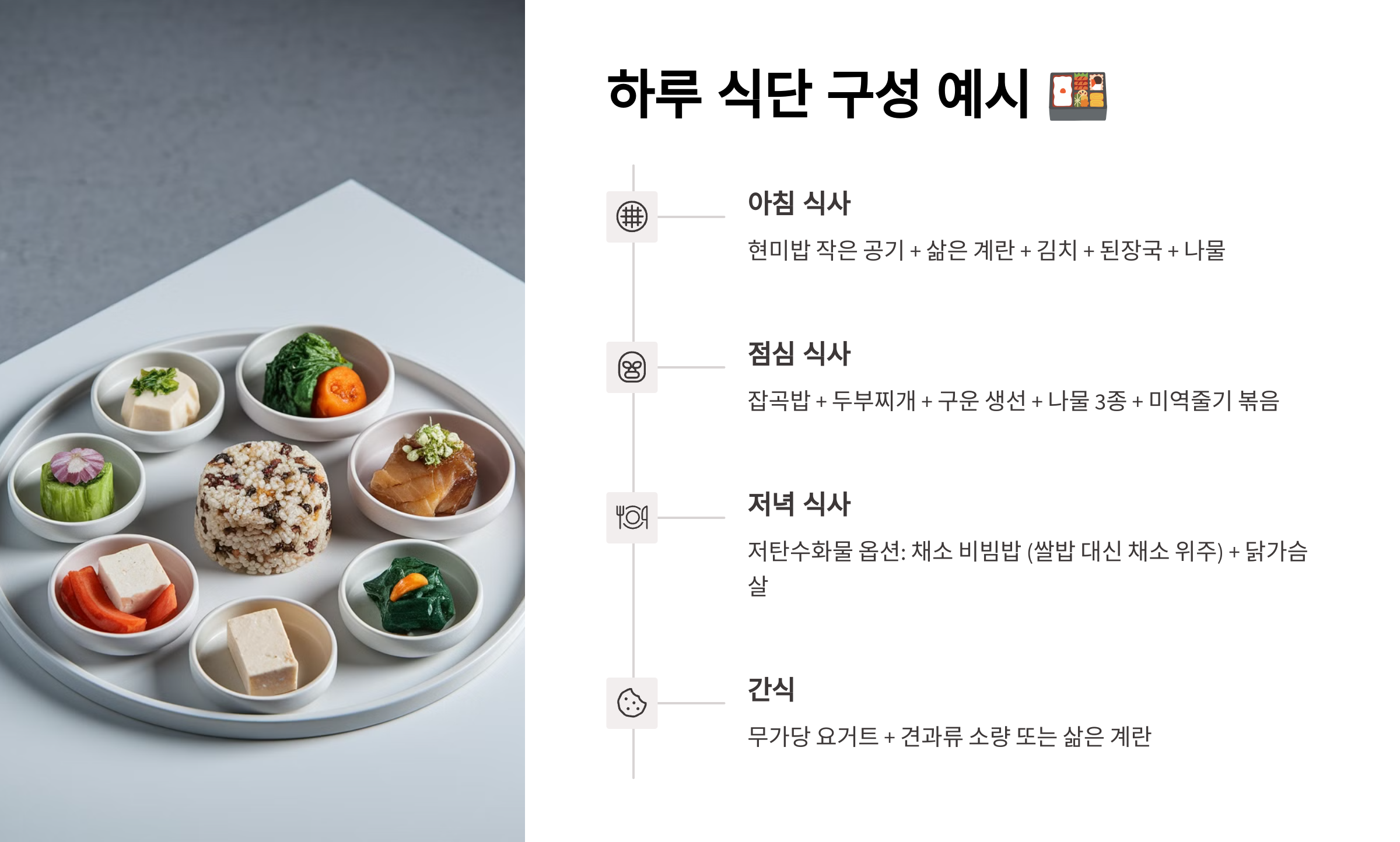 하루 식단을 어떻게 짜야 할지 막막한 분들을 위해 아침, 점심, 저녁과 간식까지 포함된 예시를 소개할게요. 이 식단은 혈당 상승을 최소화하고, 포만감을 오래 유지할 수 있도록 구성되었어요.
