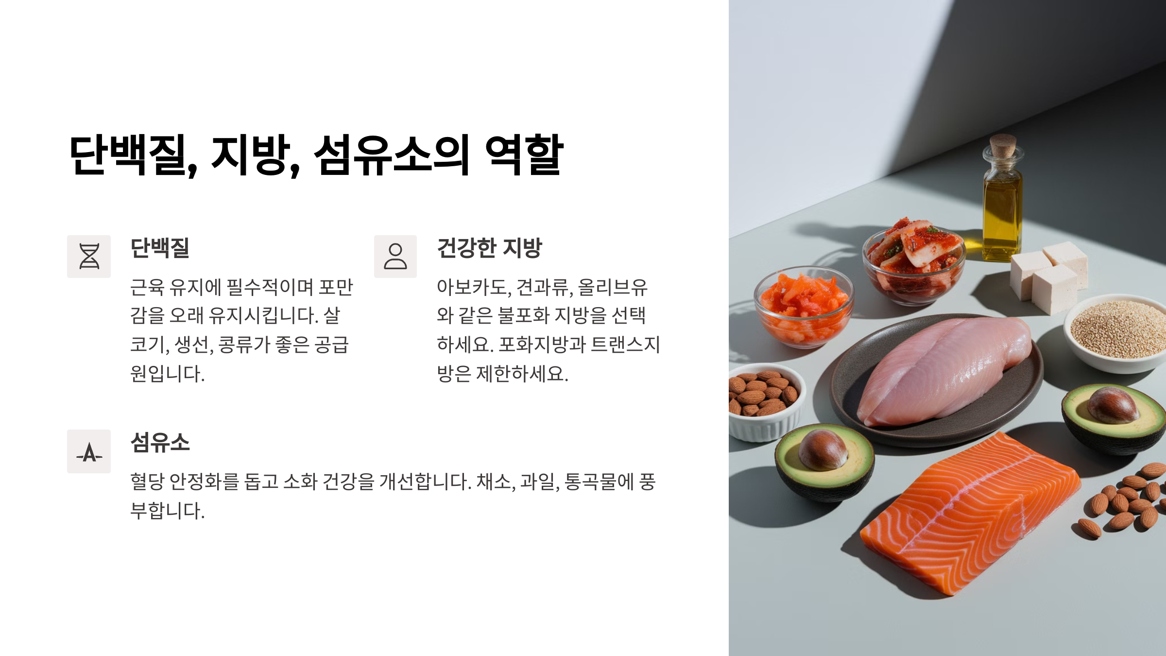 단백질은 혈당을 바로 올리지 않기 때문에 매우 중요한 영양소예요. 근육량 유지에도 도움이 되고, 포만감도 오래 가요. 닭가슴살, 두부, 계란, 생선 같은 고단백 식품이 대표적이에요. 너무 기름진 고기보다는 저지방 고단백 위주로 선택하면 좋아요.