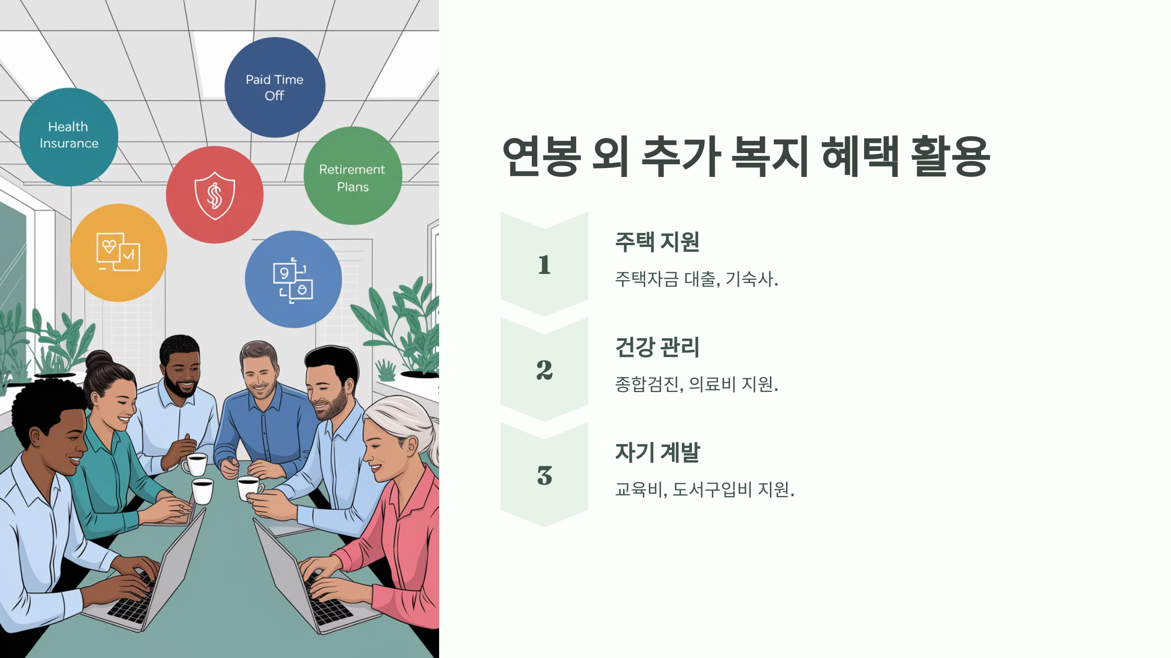 🎁 대기업들은 직원들의 만족도를 높이기 위해 다양한 복지 혜택을 제공해요. 연봉 협상 시 연봉 외에도 이런 추가 혜택을 고려하면 더 유리한 조건을 받을 수 있어요.