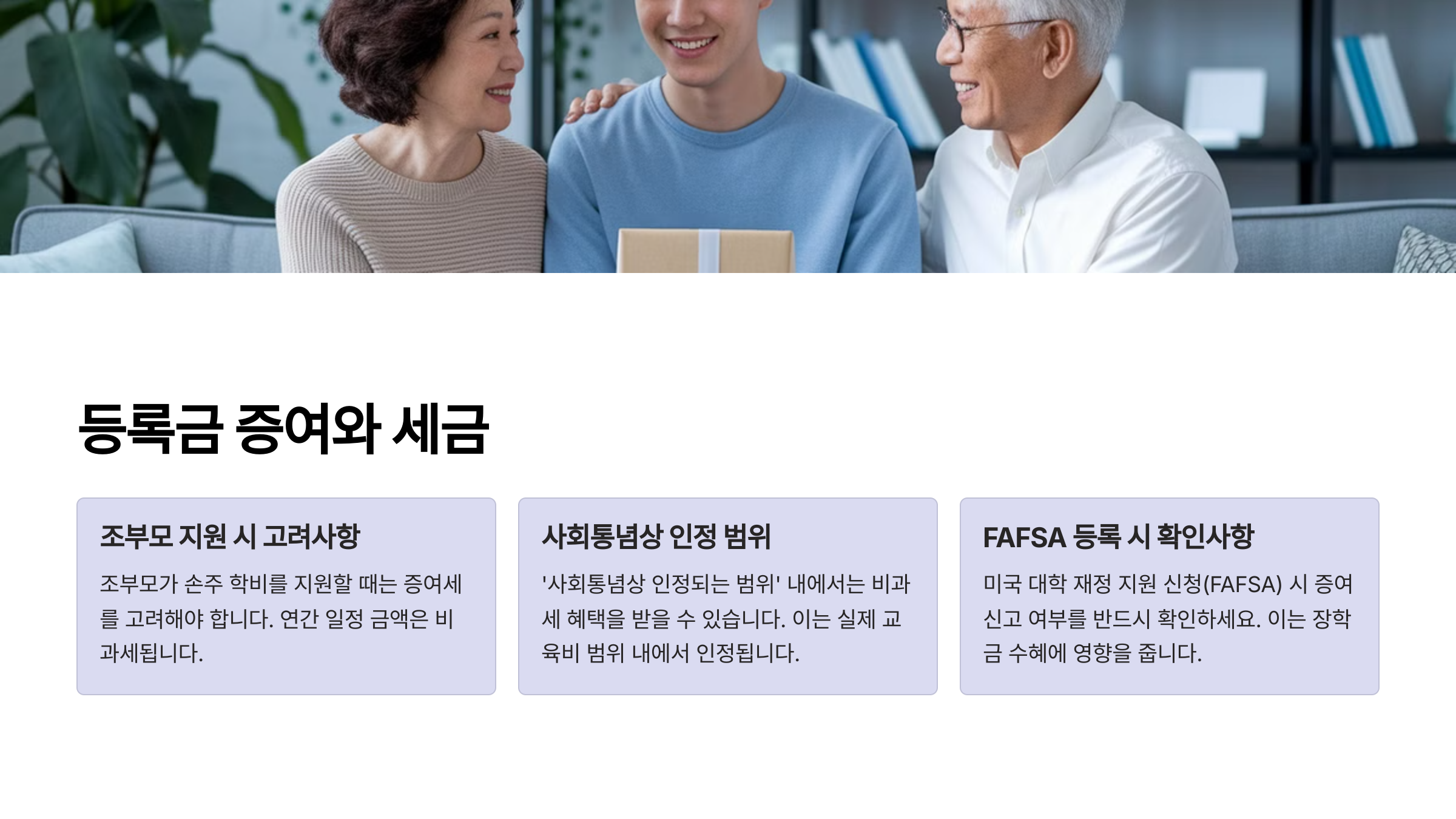 그리고 만약 외조부모나 친인척이 지원해주는 경우라면, 반드시 10년 단위 비과세 증여한도를 확인해야 해요. 자칫하면 자녀가 나중에 증여세 폭탄을 맞을 수도 있답니다.