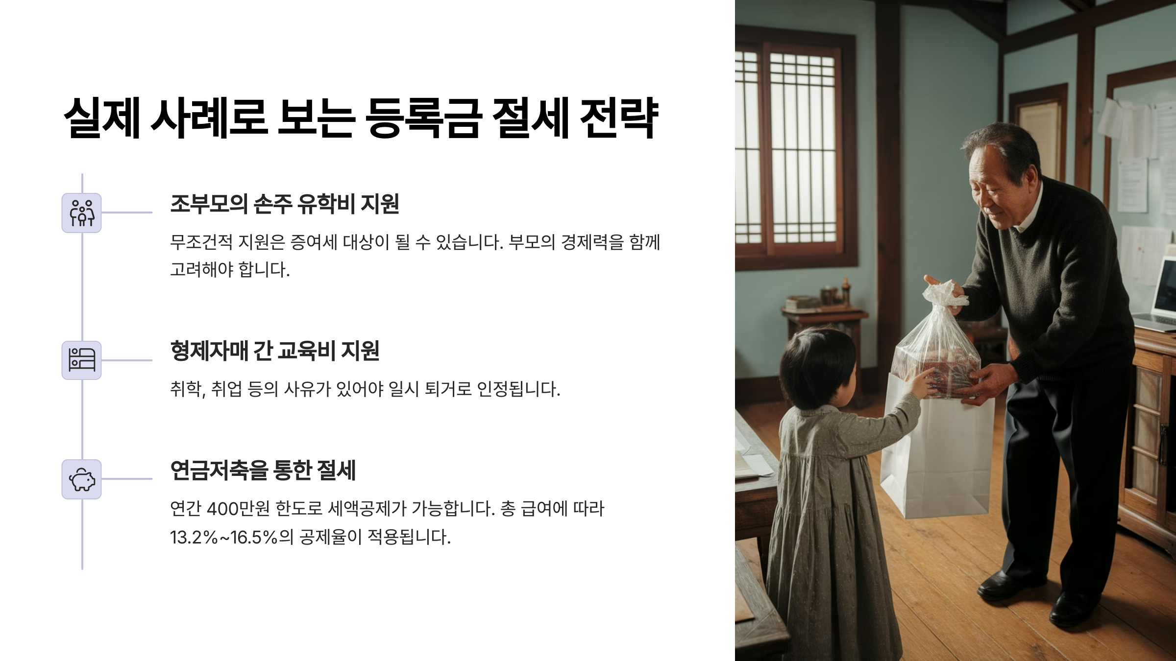 또 다른 사례로, 외할아버지가 자녀 대학 등록금을 대신 내줬다가 1,000만 원에 대한 증여세 고지서를 받은 경우도 있었어요. 그 후 부모 통장을 거쳐 지급하는 방식으로 바꿔 과세를 피할 수 있었죠.
