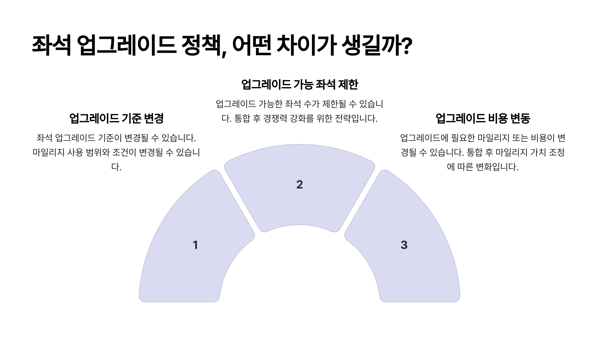 현재 대한항공의 업그레이드 정책은 비즈니스석 이상으로의 업그레이드가 제한적인 편이에요. 반면 아시아나는 상대적으로 적은 마일리지를 사용해 좌석을 업그레이드할 수 있었어요. 따라서 대한항공 기준으로 통합되면 아시아나 고객들은 좌석 업그레이드가 더 어려워질 가능성이 커요.