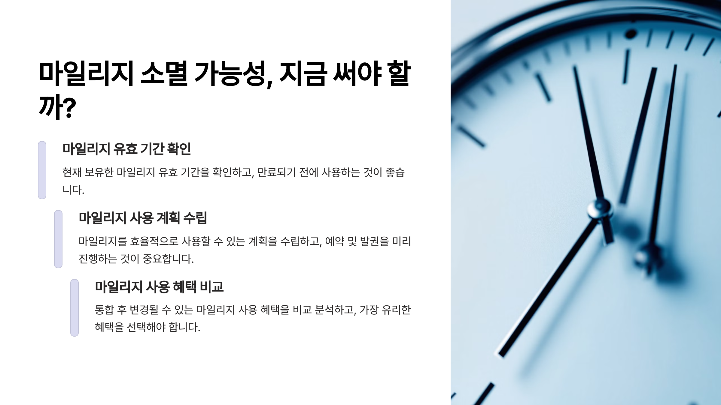 A2. 마일리지 자체가 소멸되지는 않겠지만, 유효기간이나 사용 조건이 변경될 가능성이 있어요. 따라서 합병 전에 미리 사용하는 것이 안전한 선택일 수도 있어요.