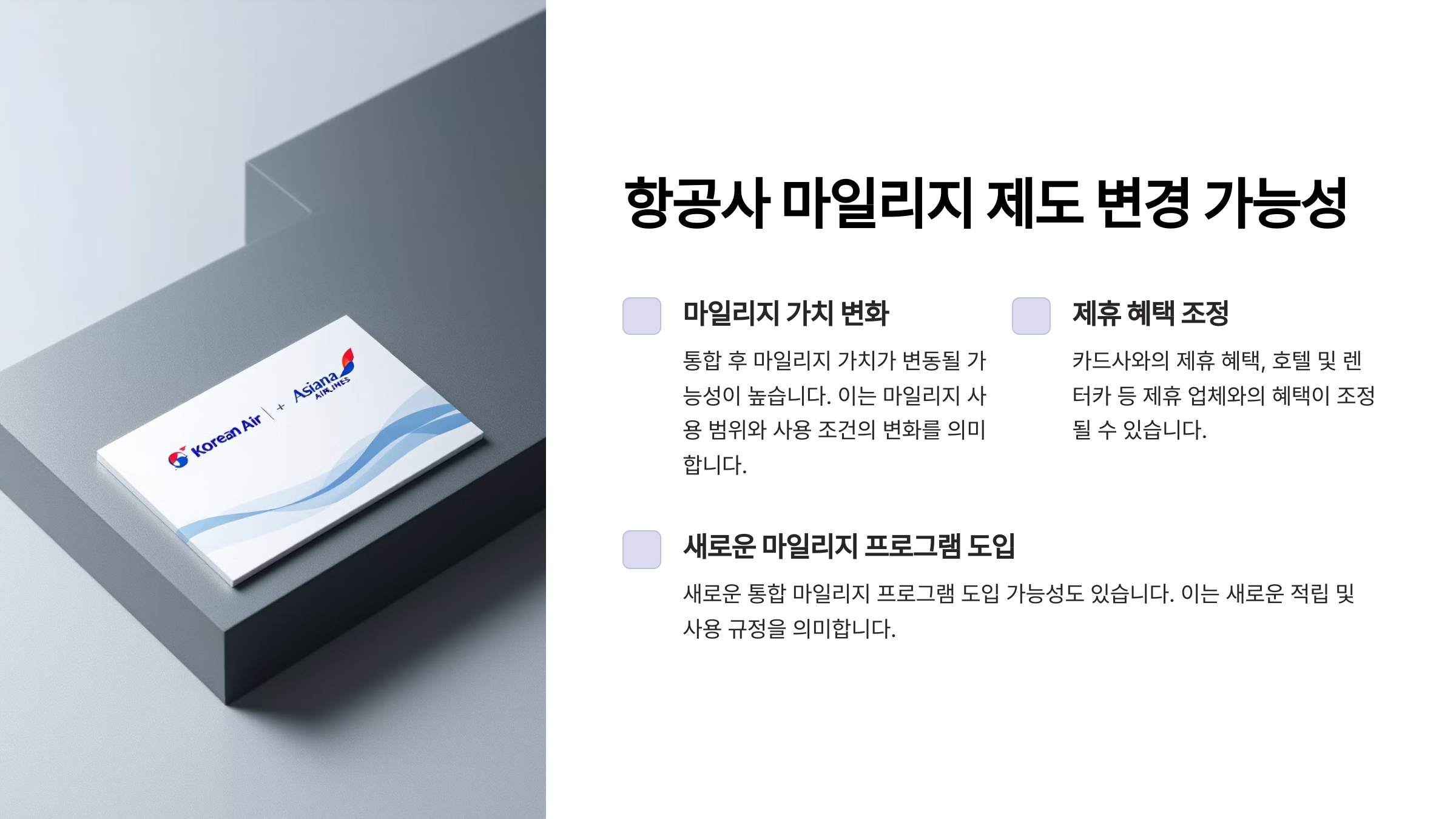 항공사 마일리지 제도는 기업의 정책에 따라 언제든지 변경될 수 있어요. 특히, 이번 대한항공과 아시아나 합병으로 인해 기존 마일리지 제도가 어떻게 개편될지 많은 사람들이 궁금해하고 있어요.
