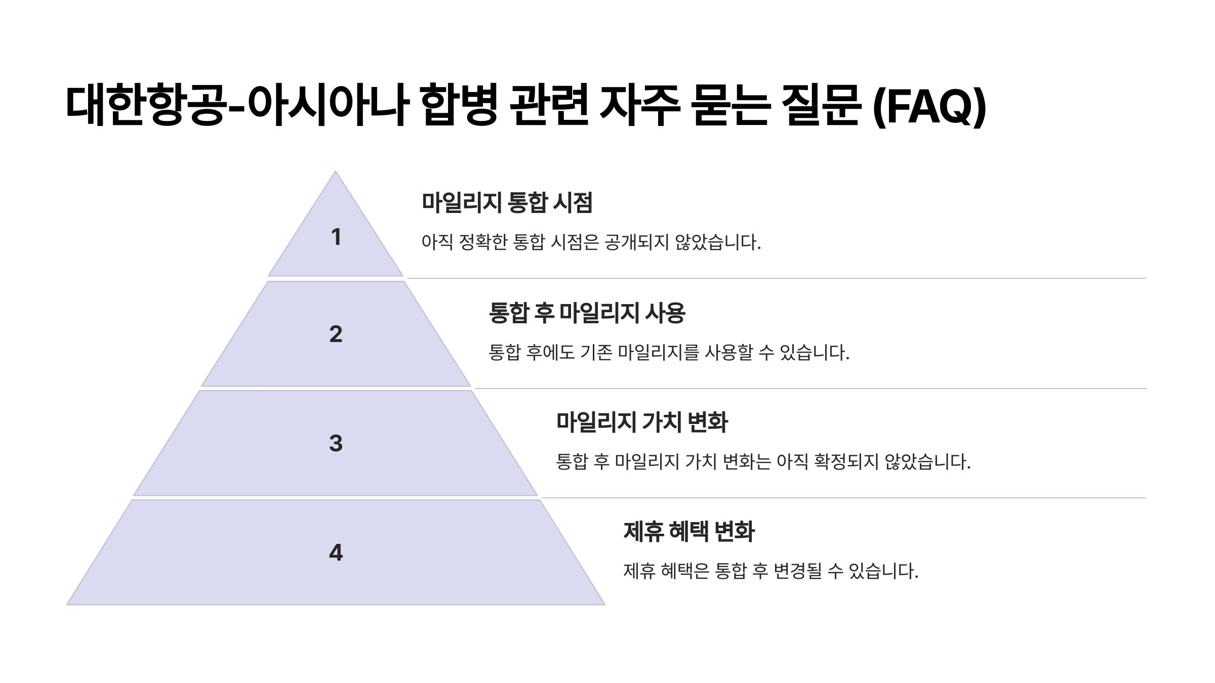 A1. 아직 공식적인 통합 방식이 발표되지 않았지만, 대한항공 기준으로 마일리지가 조정될 가능성이 높아요. 아시아나 마일리지를 대한항공 마일리지로 일정 비율로 변환하는 방식이 유력해요.