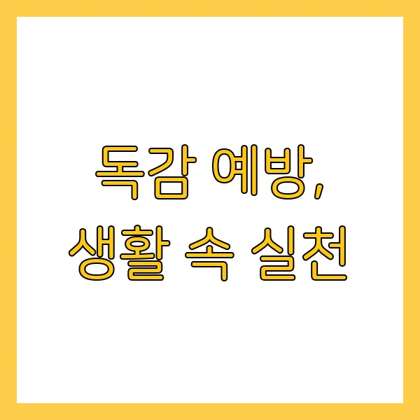 흐르는 물에 비누로 30초 이상 손 씻기는 기본 중의 기본입니다. 외출 후, 식사 전후 등 수시로 손을 씻어주세요. 기침이나 재채기를 할 때는 휴지나 옷소매로 입과 코를 가리는 기침 예절도 중요합니다. 개인위생 수칙을 철저히 지켜 독감 바이러스로부터 나를 보호해요!