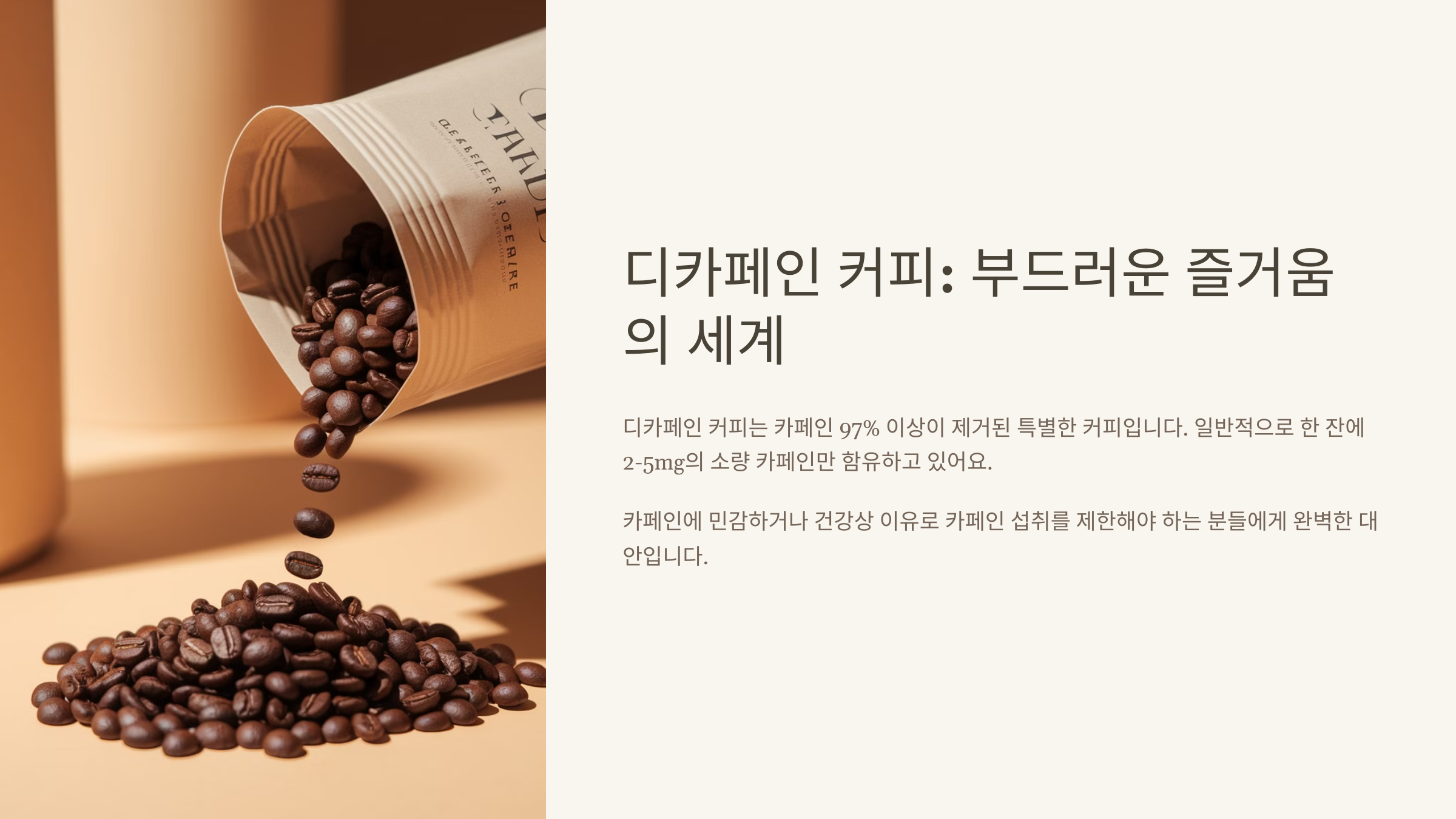 디카페인 커피는 생두 단계에서 카페인을 97% 이상 제거한 커피예요. 완전히 '무카페인'은 아니지만, 대부분의 사람에게는 거의 카페인 없는 커피로 인식되죠.