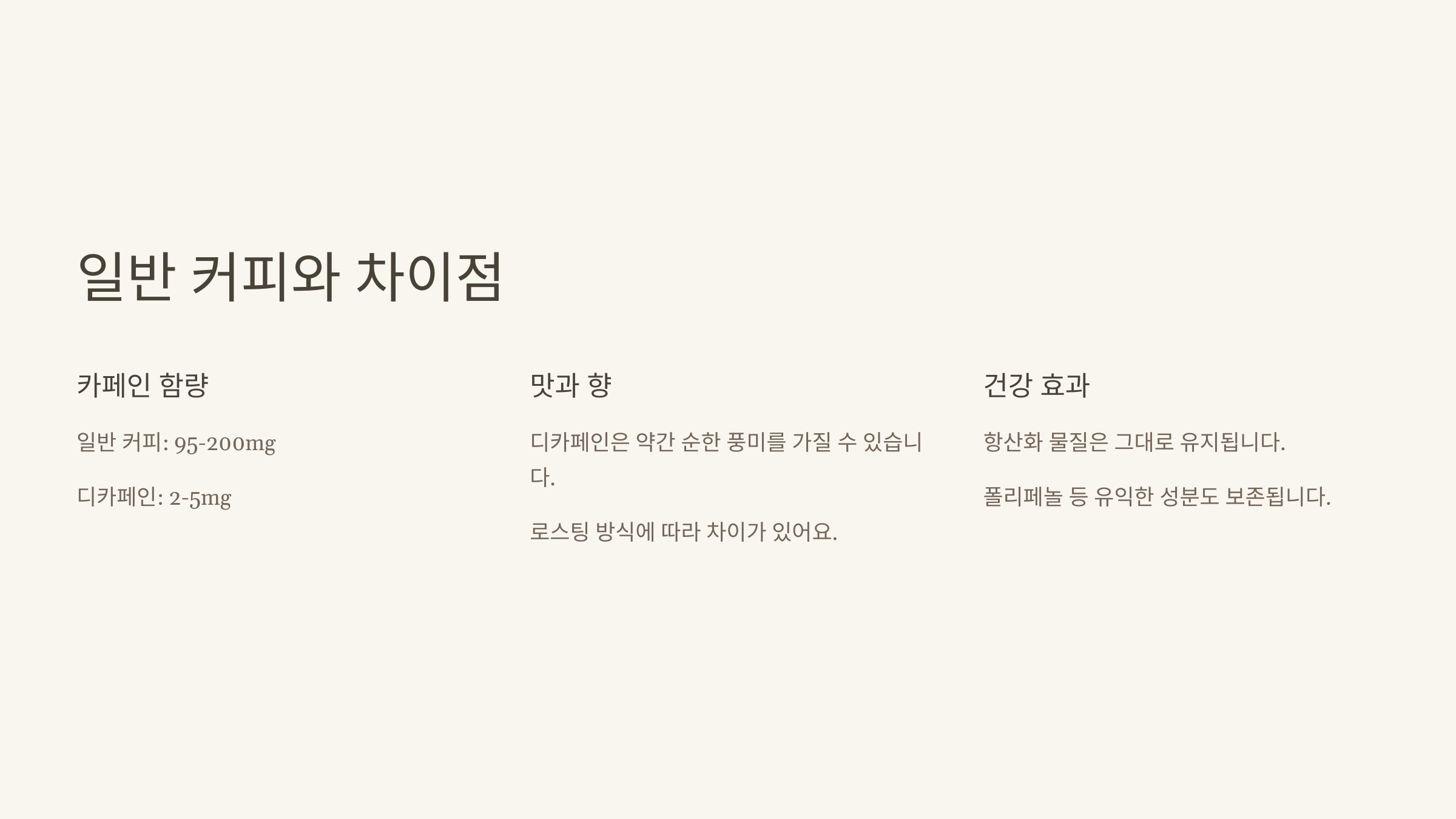 | 항목 | 일반 커피 | 디카페인 커피 |