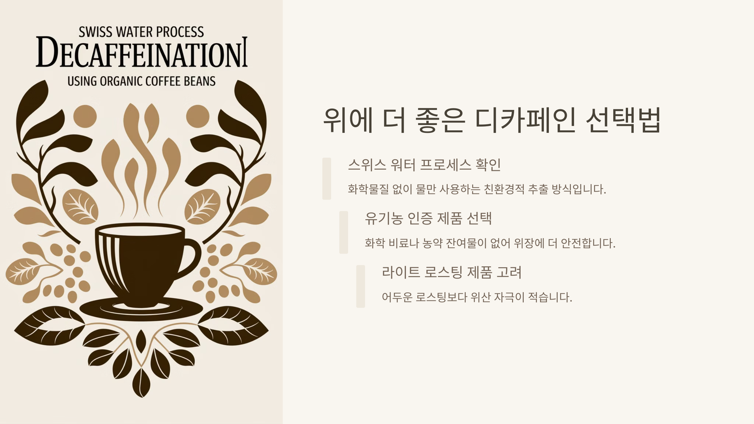 디카페인도 똑똑하게 고르고, 내 위장이 어떤 반응을 보이는지 잘 관찰하는 게 핵심이에요!