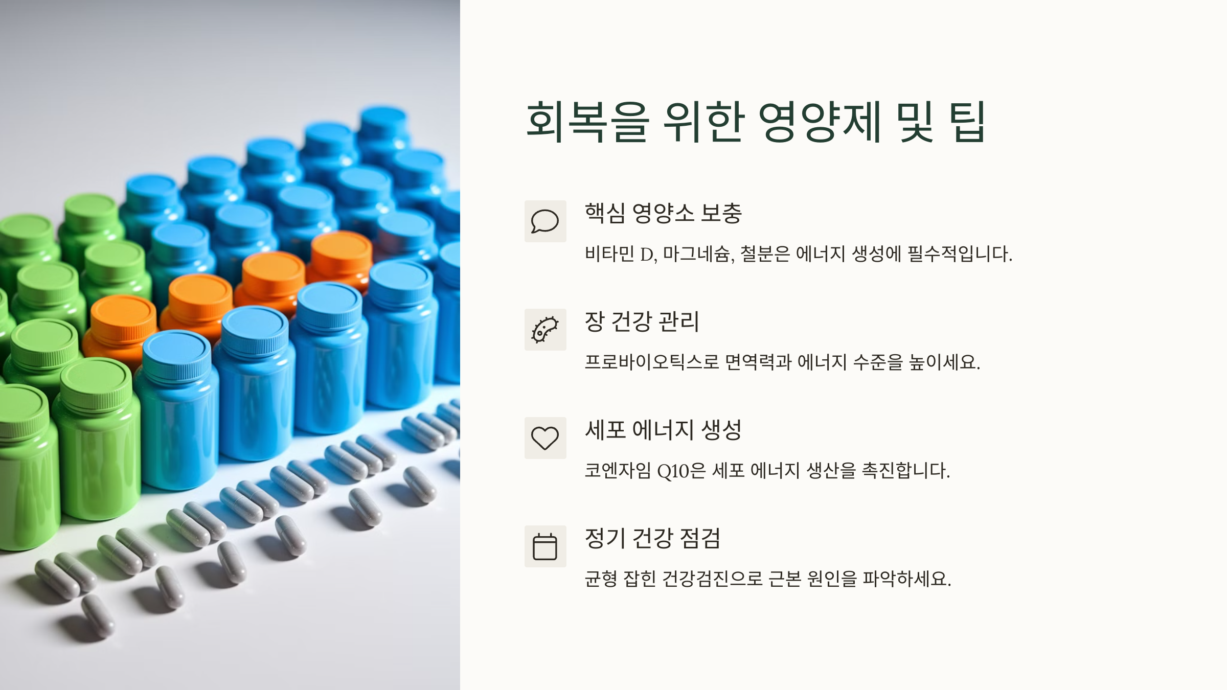 음식과 생활 습관 외에도, 필요한 경우에는 영양제를 활용하는 것도 좋아요. 특히 비타민B군, 마그네슘, 비타민D, 철분, 코엔자임Q10 등이 피로 회복에 도움이 되는 대표 성분이에요.