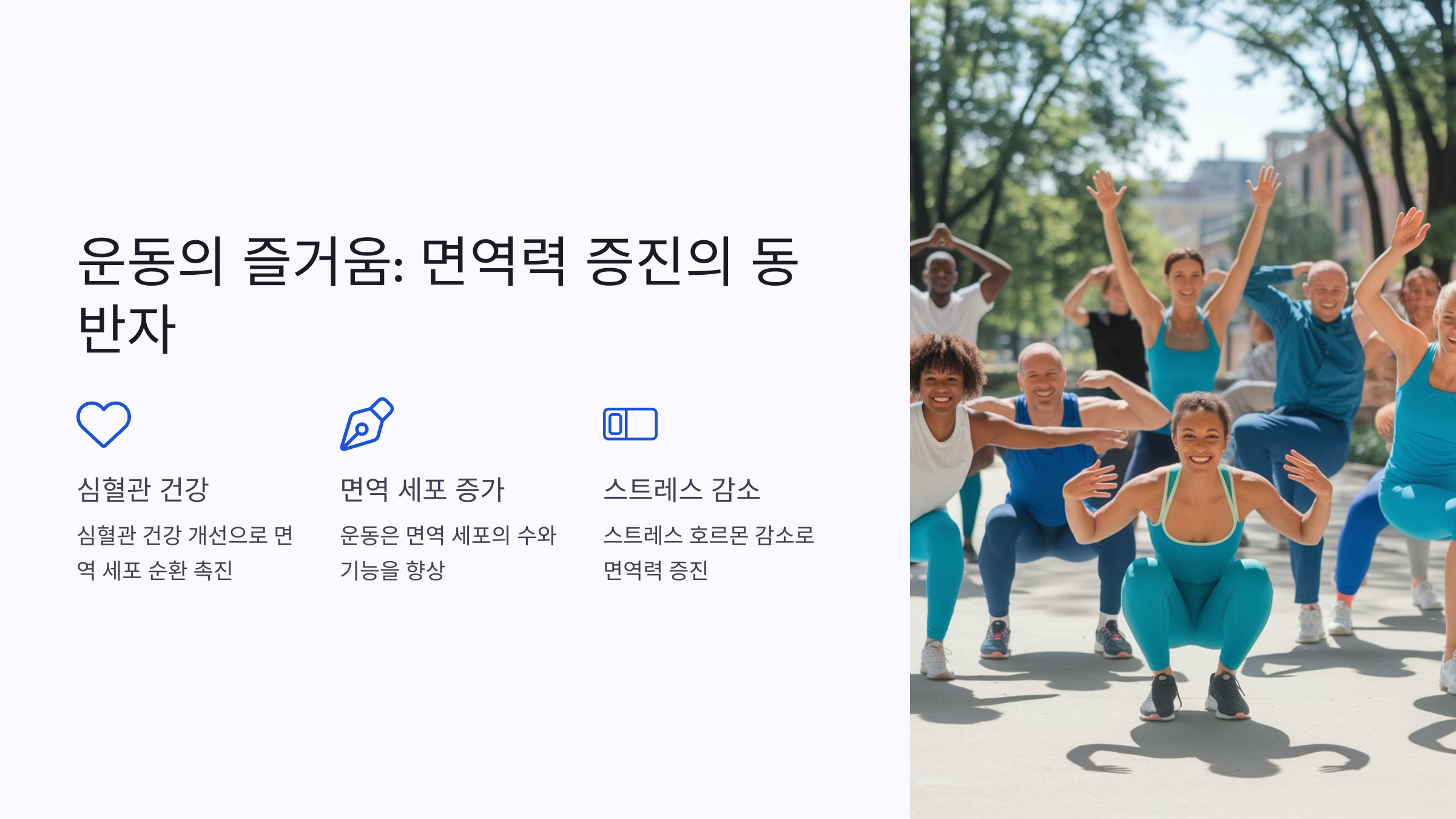 | 면역력 강화 | 운동을 통해 백혈구 활성화 및 감염 예방 |
