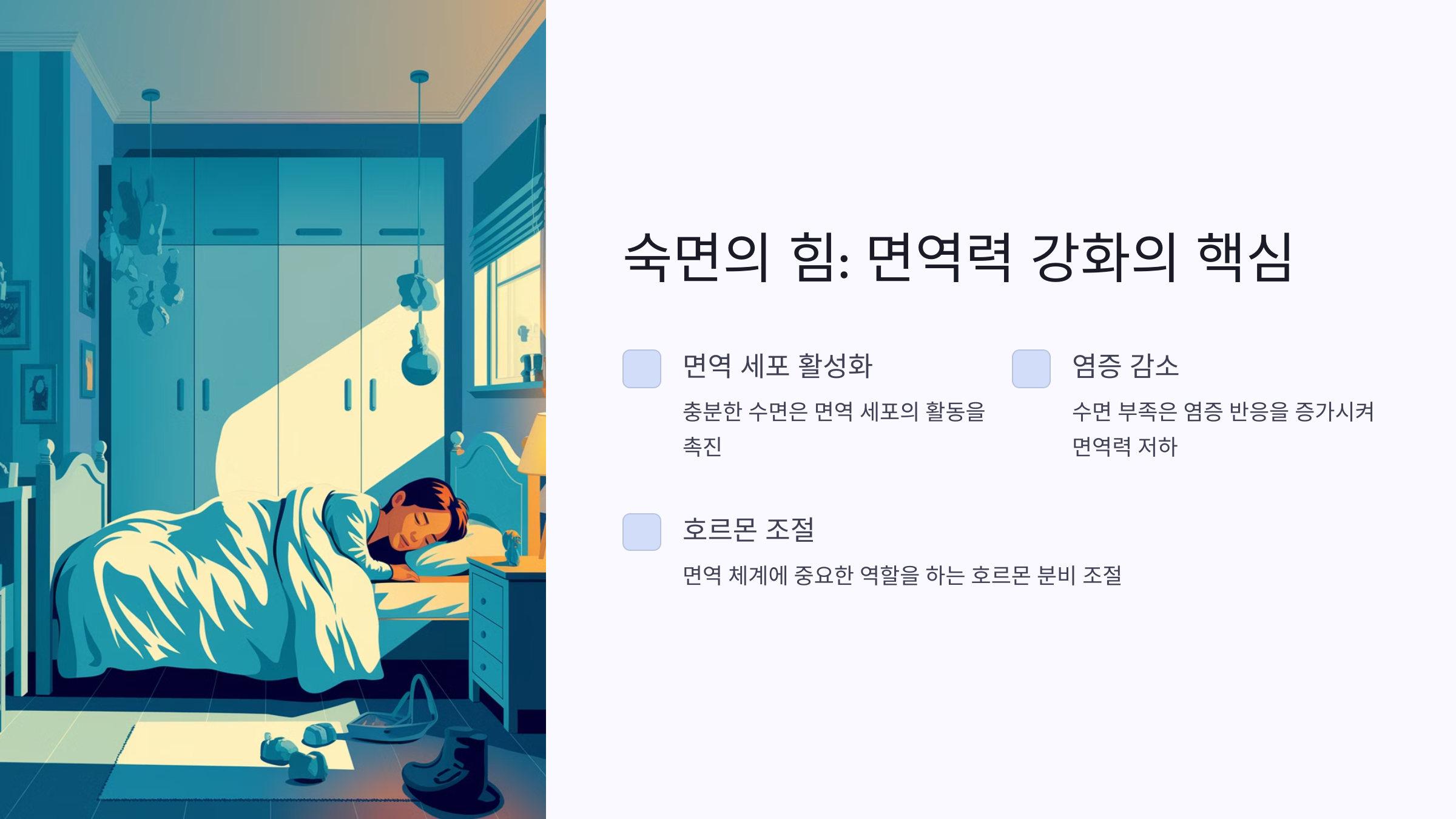 A3. 연구에 따르면 수면이 부족하면 면역세포 기능이 약화되고, 감기와 독감 등에 걸릴 확률이 3배 이상 증가한다고 해요. 최소 7시간 이상의 숙면을 취하는 것이 면역력을 유지하는 데 필수적이에요.