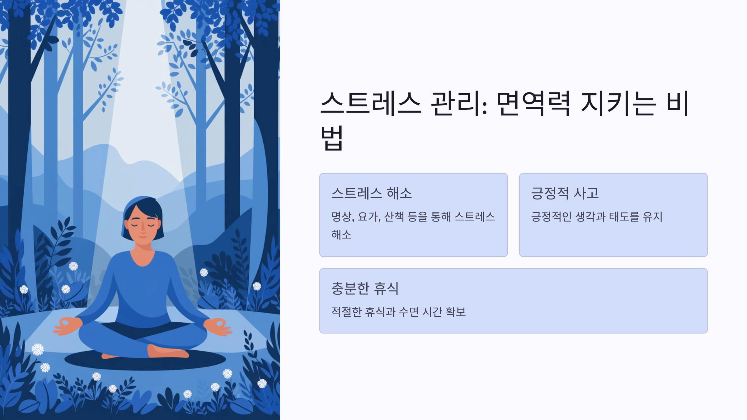 | 스트레스 관리 | 명상, 취미 활동, 호흡법 활용 | 면역 저하 예방 |