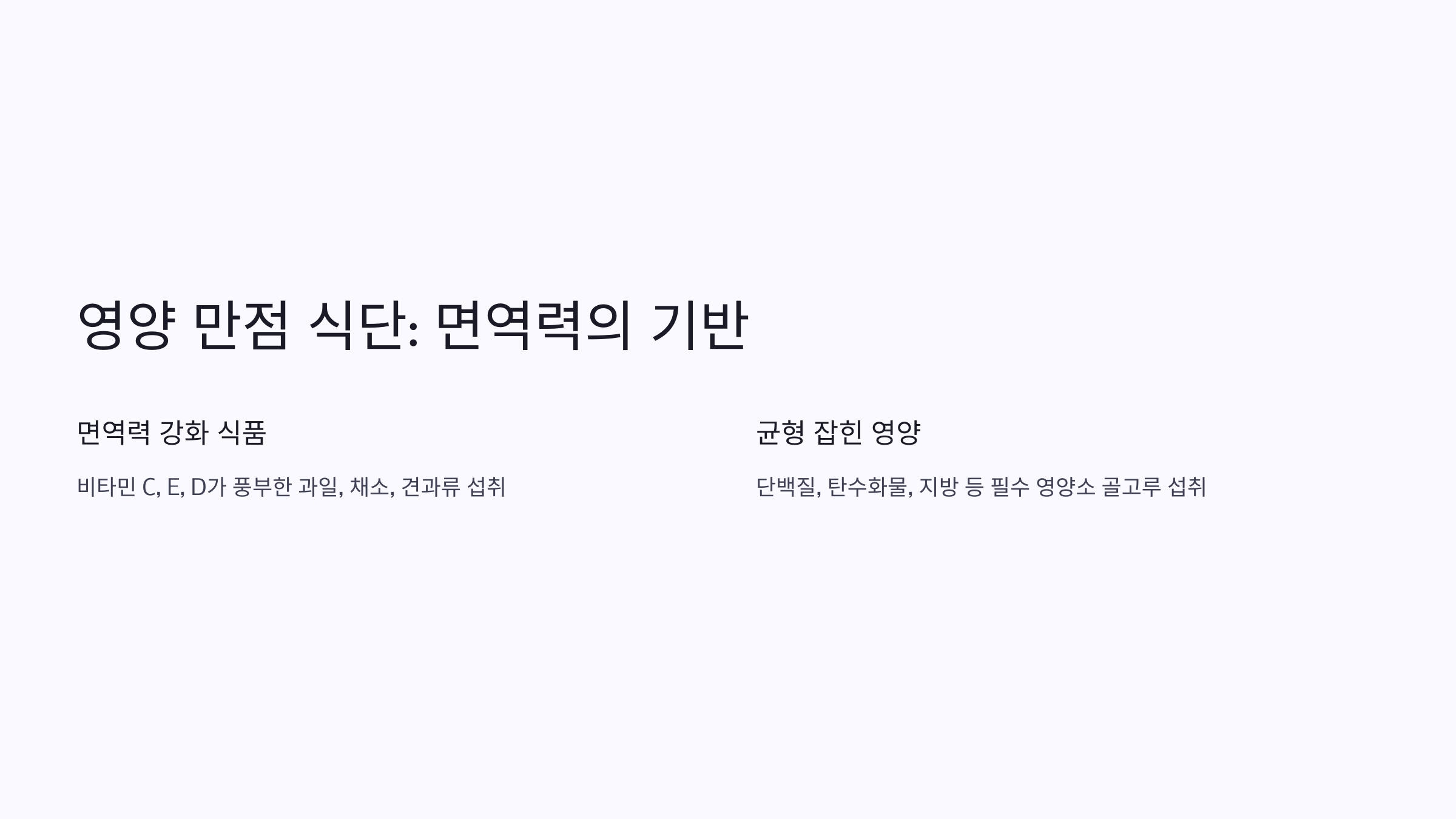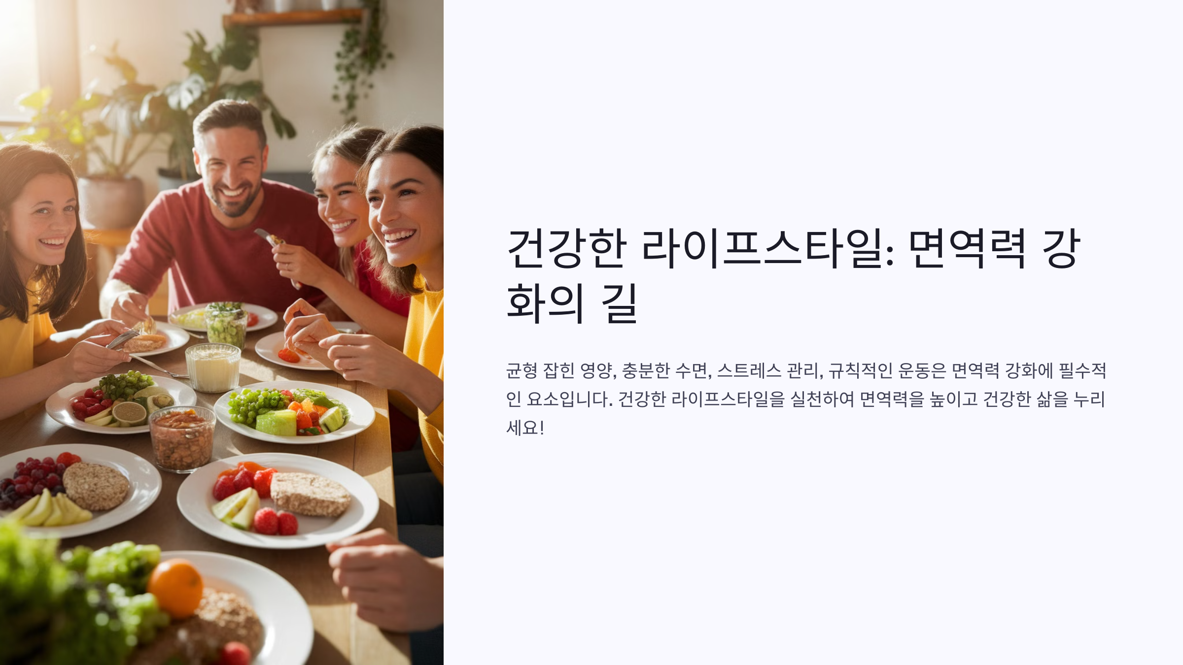 A1. 균형 잡힌 식단, 충분한 수면, 스트레스 관리, 규칙적인 운동이 핵심이에요. 특히 비타민 C와 D, 아연, 프로바이오틱스를 포함한 건강한 식사를 하면 면역력 강화에 큰 도움이 돼요.